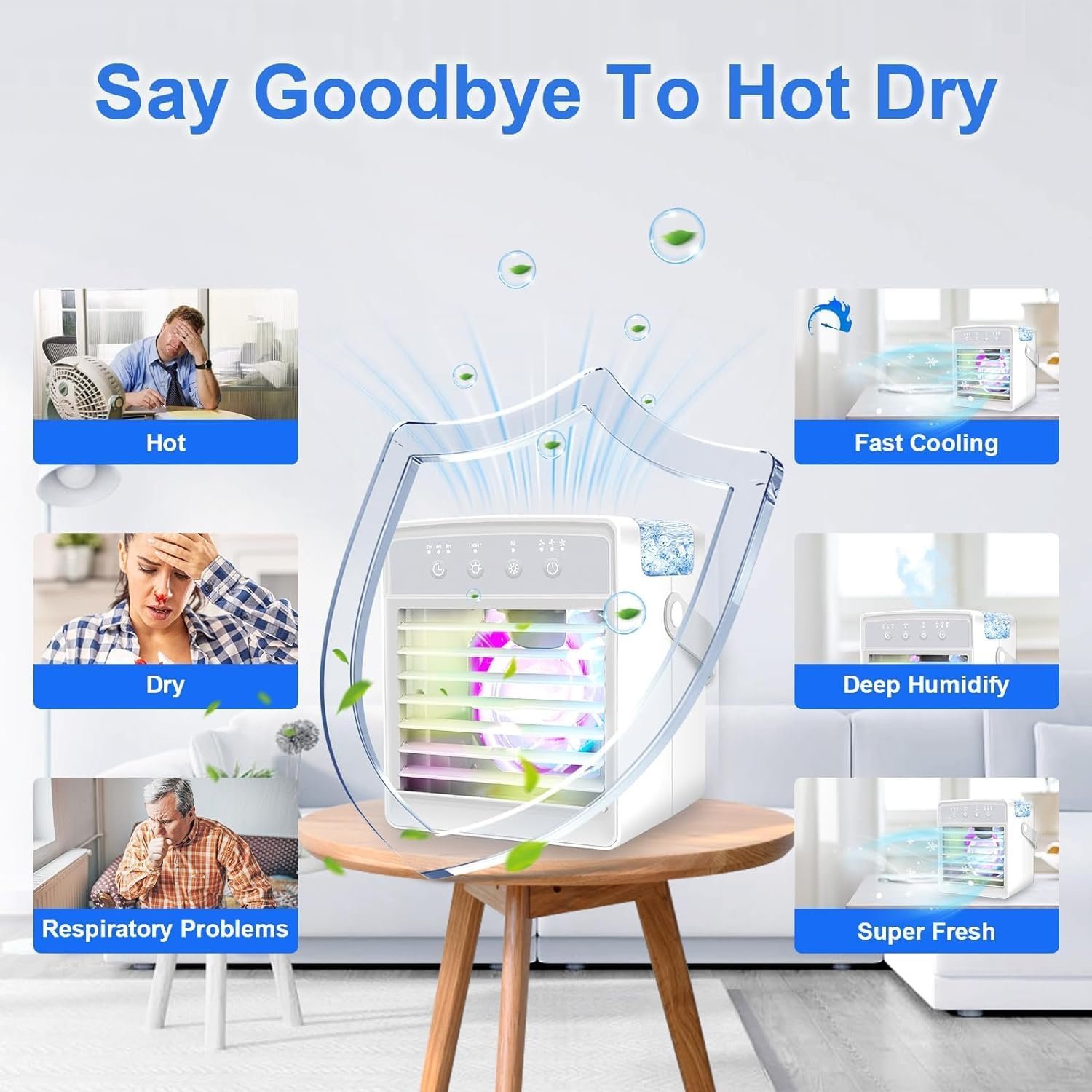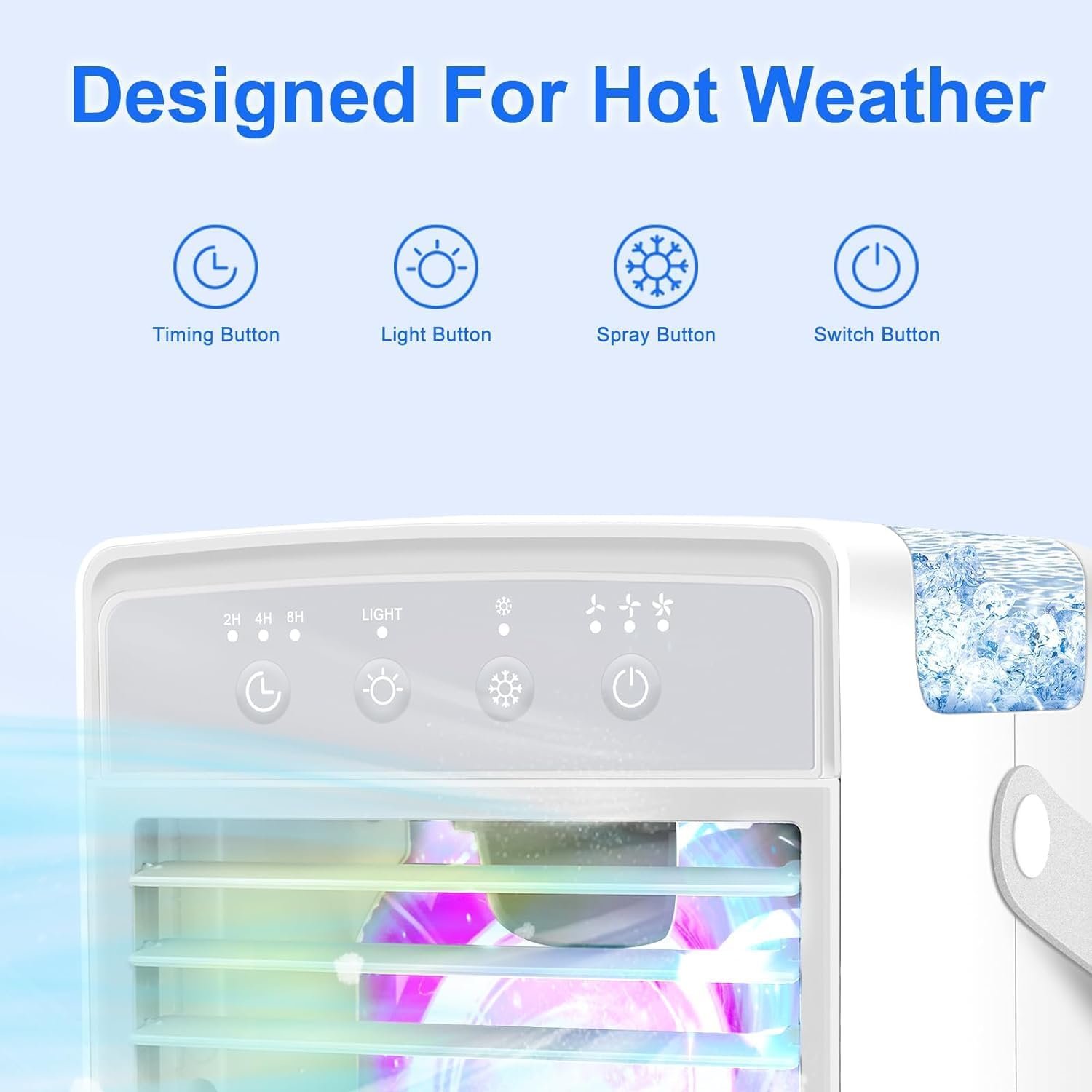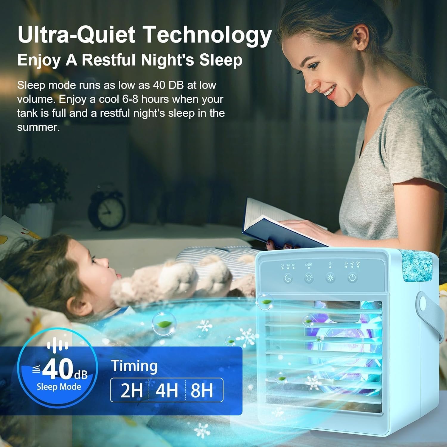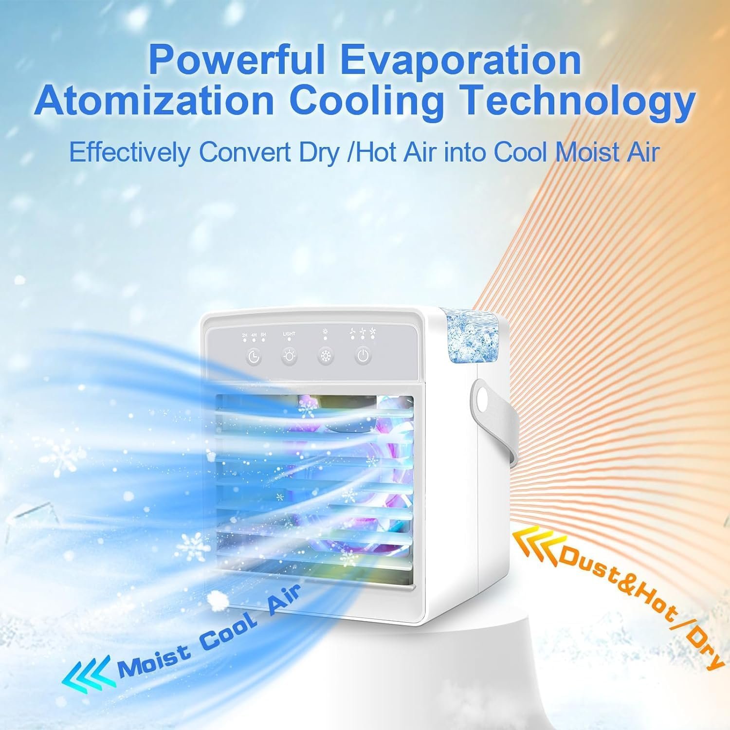 ❄️【2024 Upgraded Portable Air Conditioners】The portable air conditioners can be used as desktop cooling fan, mini air conditioner, air humidifier, 7-color night lights. The upgraded larger 300ML water tank allows you to enjoy the humidification effect for up to 8 hours in the hot summer. 2024 Upgraded powerful cooling technology allows you to feel the cooling in seconds, turning on the air conditioner to bring you a cooling summer.