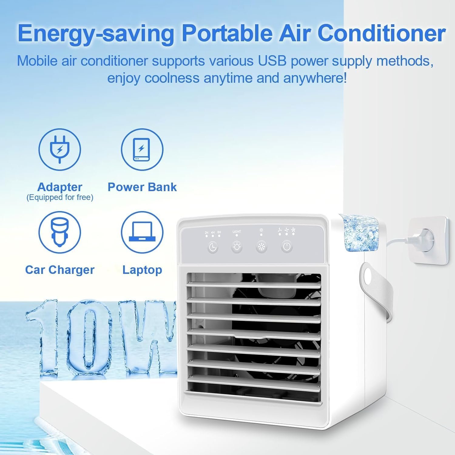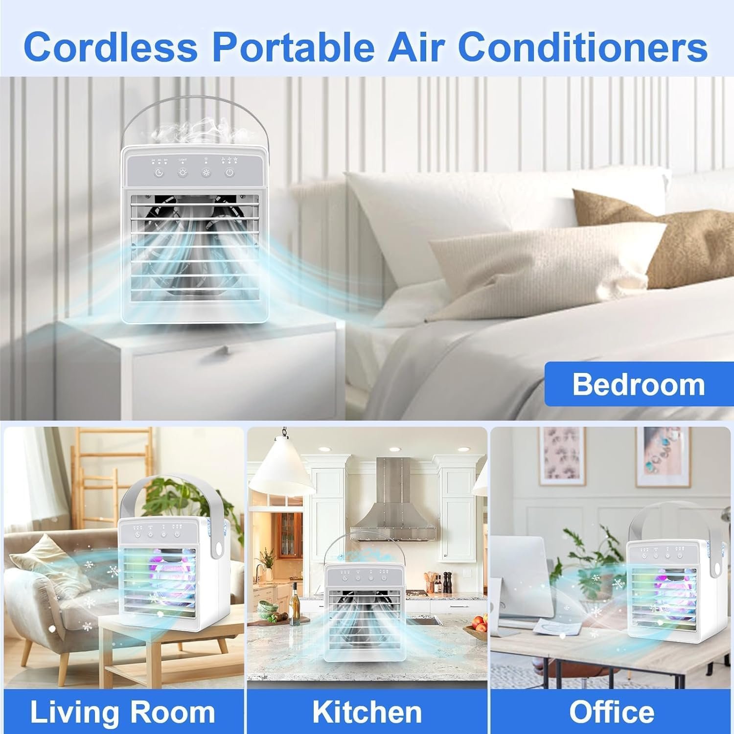 ✨【Portable USB Powered Air Cooling Fan】All you have to do is add water & ice cube into the 300ml water tank. The small portable air conditioner is ideal for using at homes, kitchens, bedrooms, dorms, desks, offices, and garages, as well as RVs, cabins, outdoor tents, backboard parties, holiday and camping.