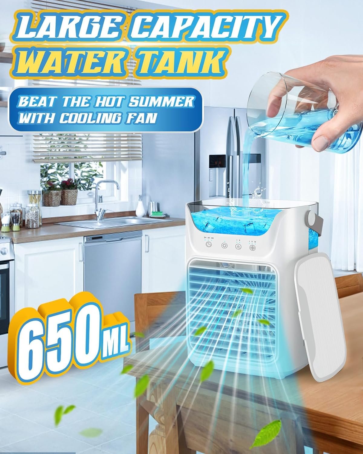 ☃【650ML Large Water Tank】 Mini air conditioner fanquipped with 650ML water tank, air cooler can work continuously for 6-8 hours after filling with water, without frequent water refill. The top tank design increases the convenience of adding water and prevents leakage. Small ice cubes can also be added to enhance the cooling effect. Transparent water tank, you can check and control the water level at any time. The rear aspirator contains a dry sponge to absorb the moisture in the humidifier.