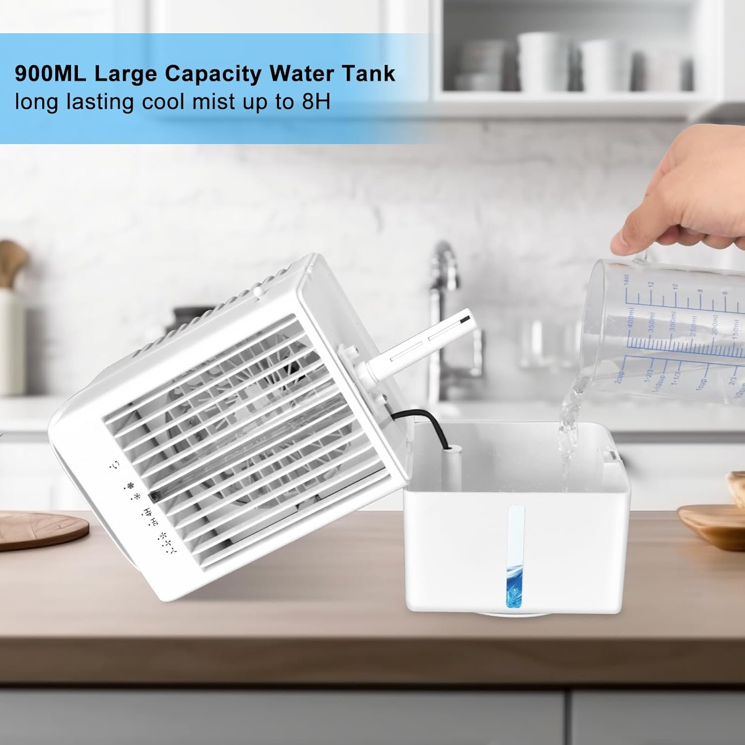 Large-capacity water tank~900ml ultra-large-capacity water tank allows for continuous operation of up to 6-8 hours, reducing the need for frequent refilling, ensuring extended and more sustained cooling comfort.