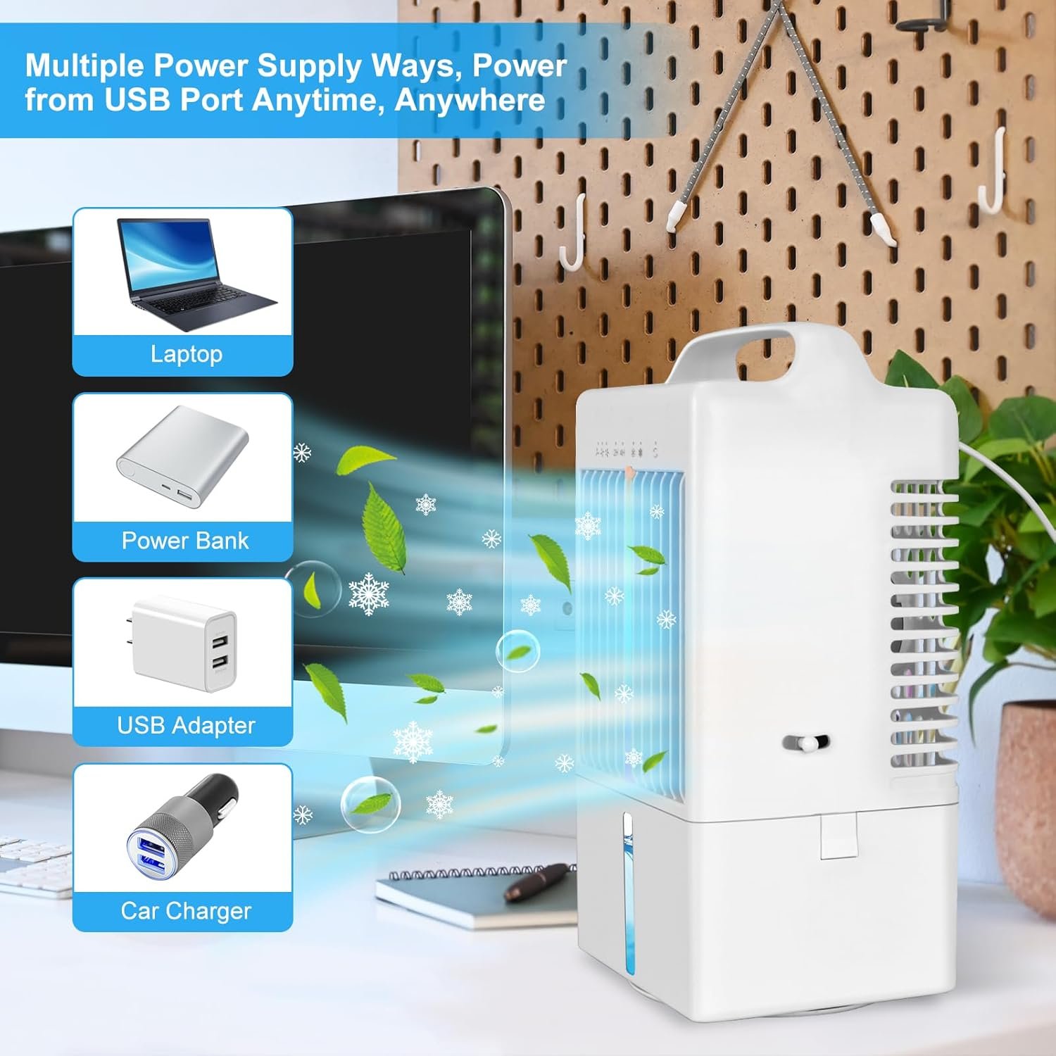 Multiple power supply Options~ Convenient and fast, this small portable air conditioner comes with the ability to charge on-the-go. Strong compatibility with USB power sources, such as laptop, wall socket, portable power bank, or even in a car, etc.