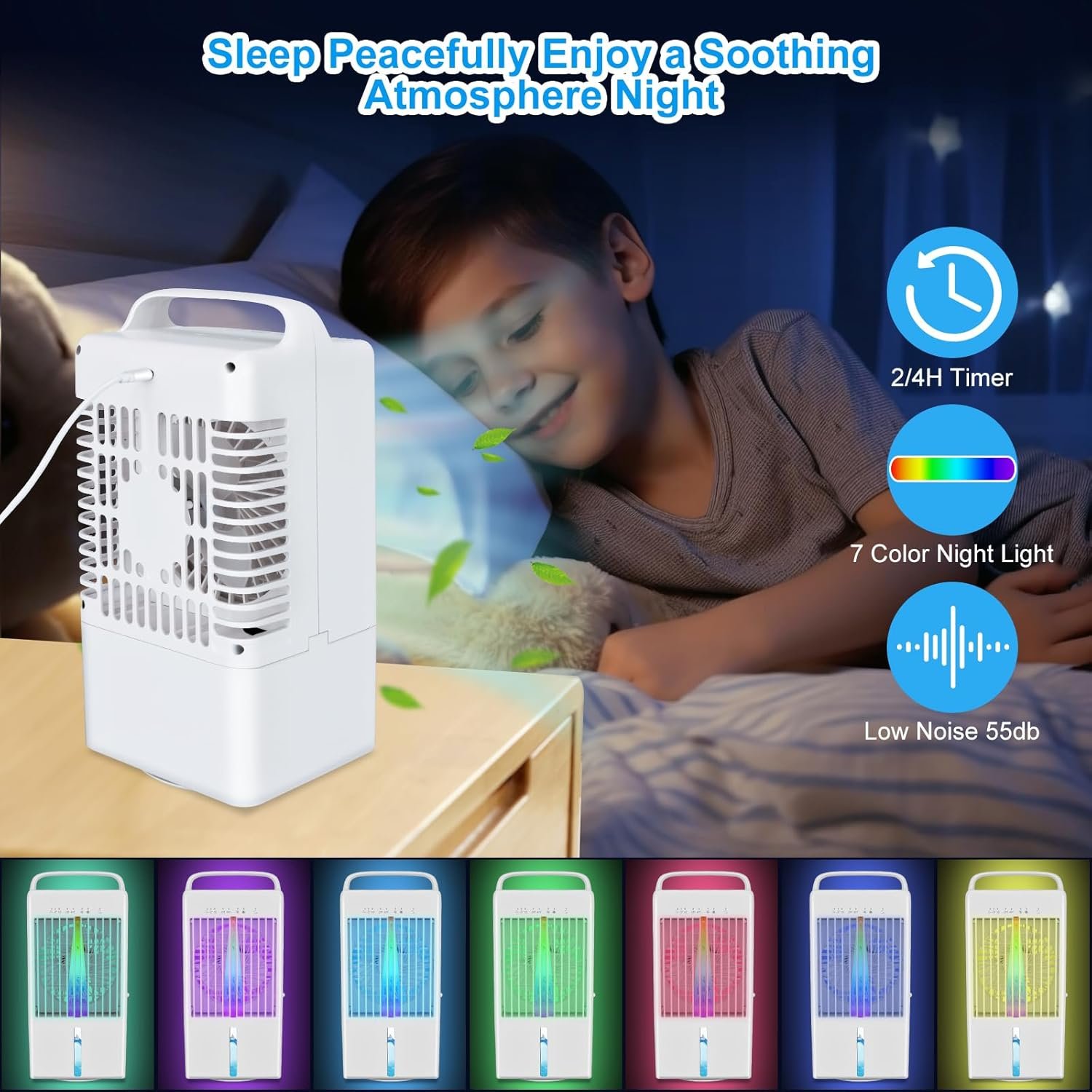 Three adjustable fan speed settings for your preference~ You can modify the wind speed according to the ambient temperature, catering to various temperature needs. (It’s recommended to use the second gear mist humidification setting for optimal results.) Additionally, this air conditioner fan offers 2/4-hour timer functions.