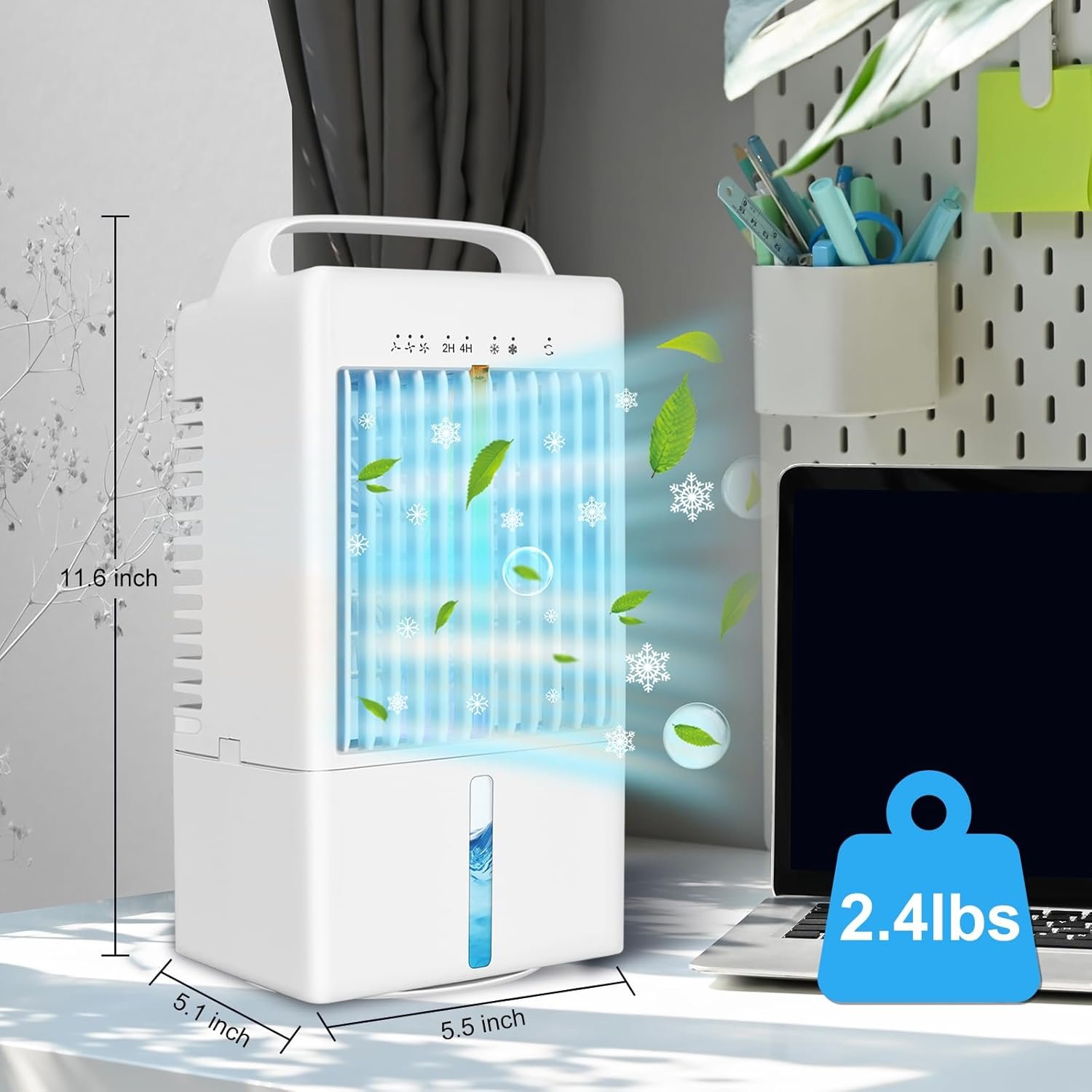 This personal air conditioner features a 90-degree oscillating head that rotates, allowing for adjustable airflow direction to prevent direct and uncomfortable blasts of cool air. It delivers widespread coverage, enabling multi-angle enjoyment with flexibility.