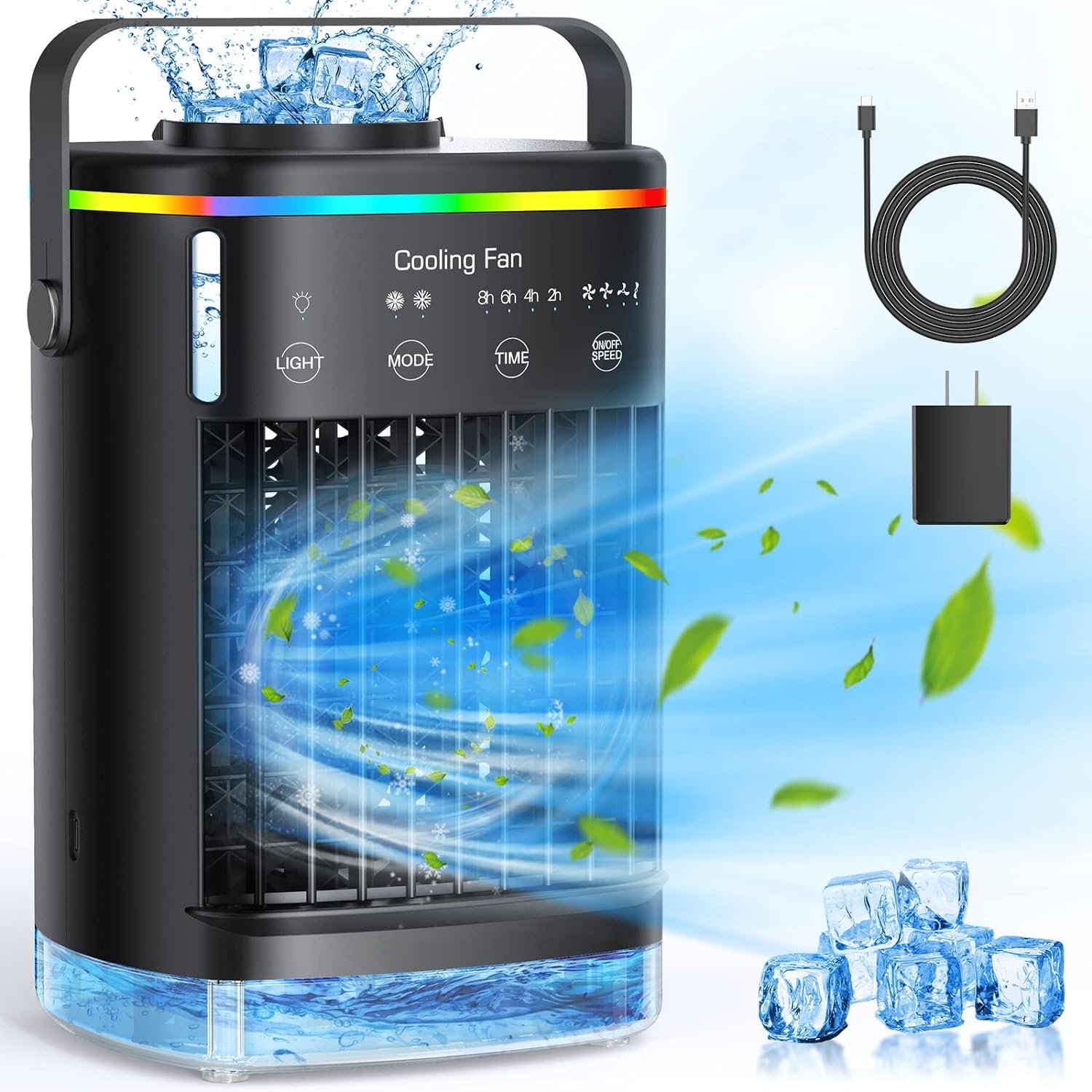 【2-8H Timer & 7 Color Night Light】 Air conditioner portable has 4 kinds of intelligent timing modes (2H/4H/6H/8H) and 120° up & down adjustable wind direction, allowing you to enjoy a deep sleep or a nap without the headaches and colds caused by long-term cool air. 7-color night light automatically changes, cooling fans for rooms/bedroom, creating a comfortable and relaxing sleeping environment. The lights can be turned off.