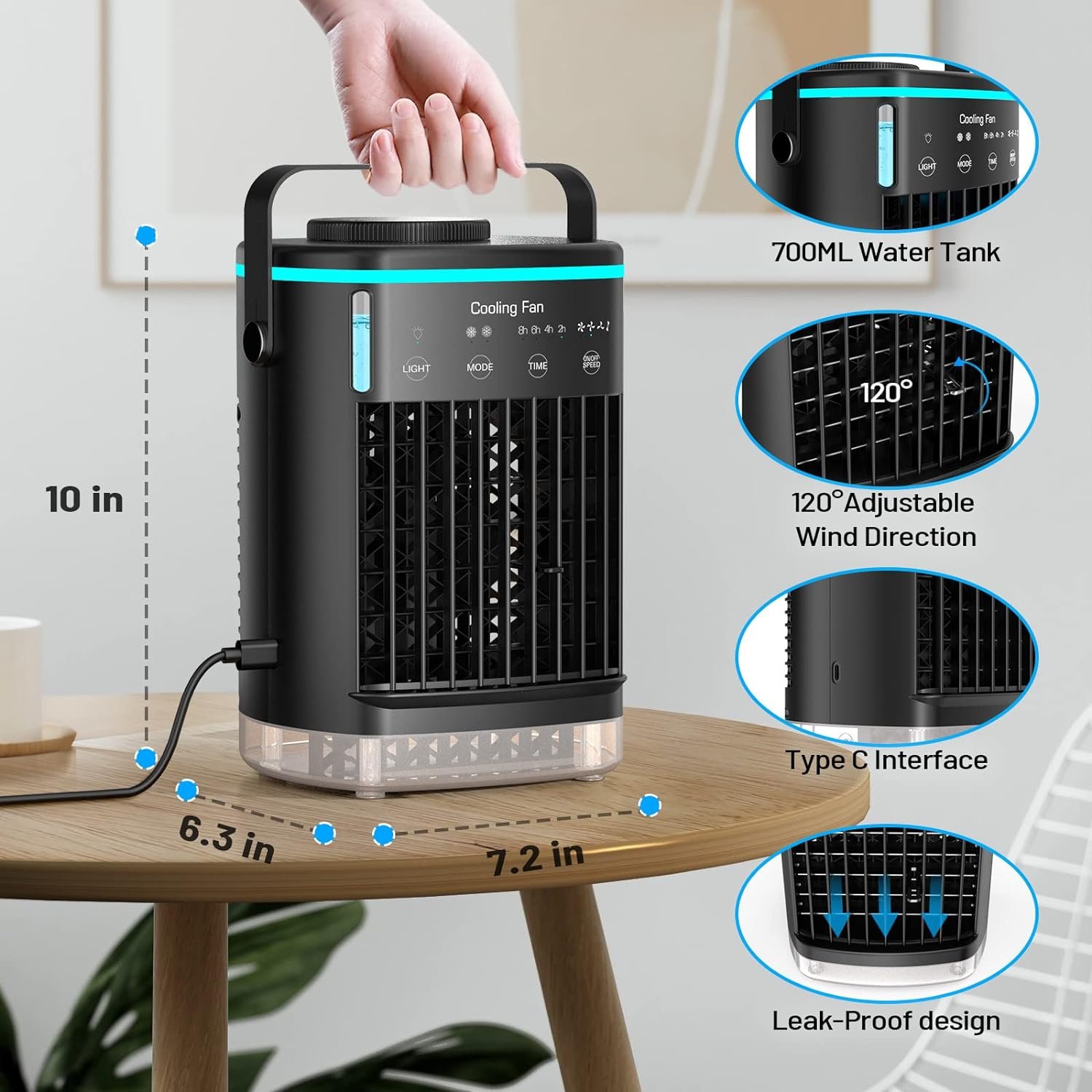 【Large Water Tank & Long Lasting】 Personal air conditioner with a 700ml sealed water tank, this air cooling fan can work 8-10 hours when filled up and avoids frequent addition of water. It will start protection and change to the natural wind when the water runs out, so you don’t worry about it when you fall asleep.