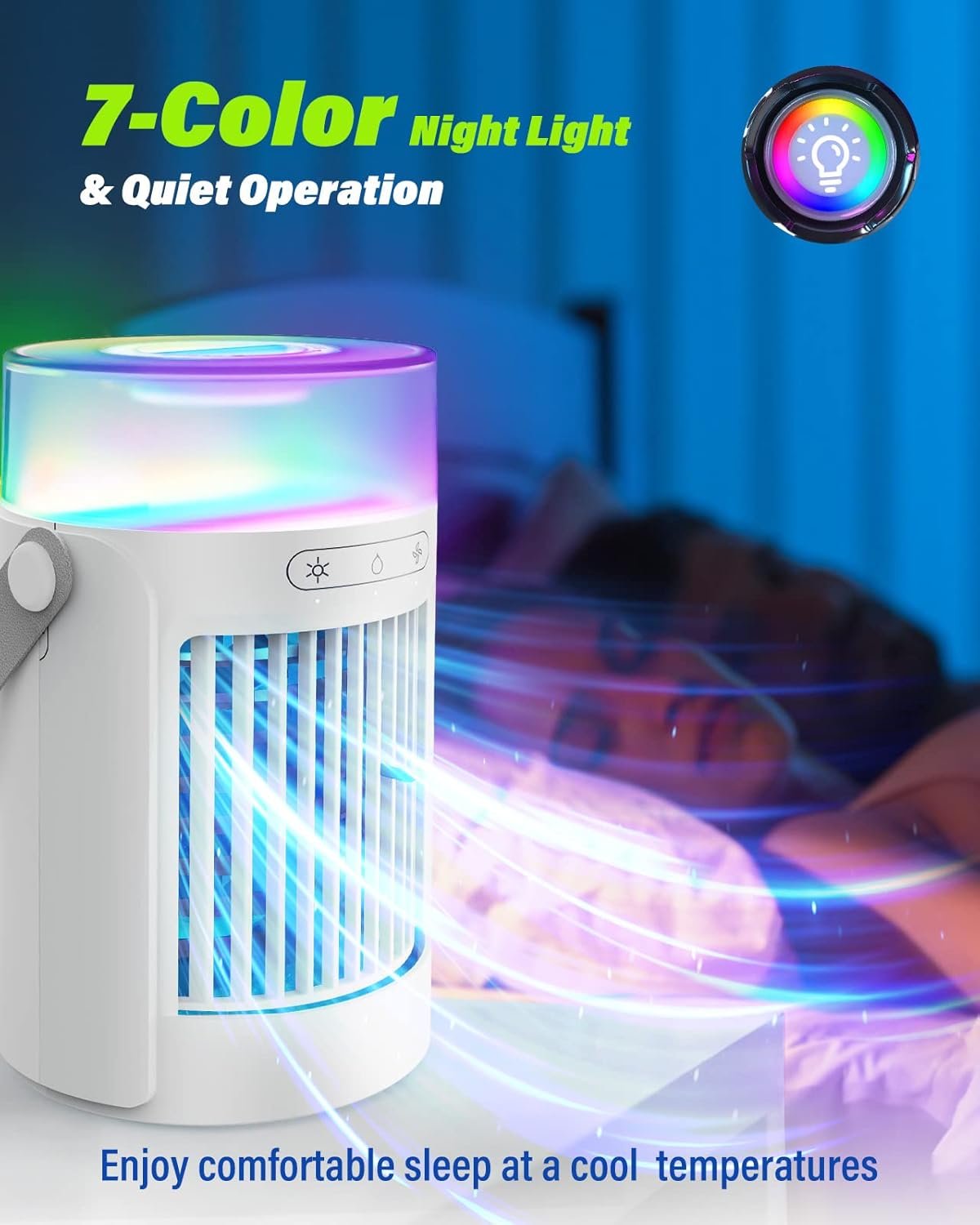β7 πΎππππ-πΎππΎππ ππππππ ππππππ & πππππ πΎππππππ: This mini air conditioner is built-in 7 soft colors night light, you can set the setting to automatic color cycle, or you can fix the color you like. The lightweight & whisper-quiet fan plus soothing night light make it perfect to use overnight for a comfortable sleep. Specifically designed for quiet operation, the unique air duct and advanced fluid dynamics ensure a silent operation.
