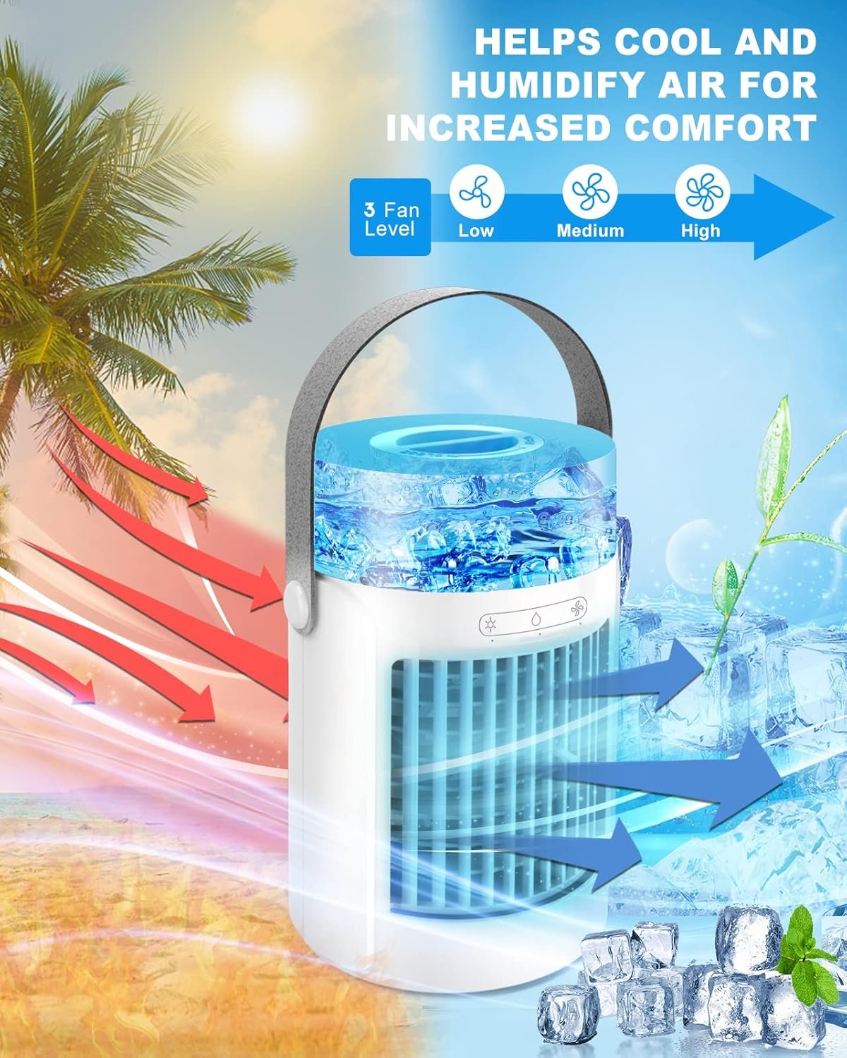 β4-ππ-1 πππππππΌπ πΌππ πΎπππΏππππππππ: Portable air conditioners combines ordinary fan (no water or ice), humidifier (water added), mini air conditioner (ice and water added), and LED night light, one machine with 4 main functions. Upgraded powerful cooling technology allows you to feel the cooling effect in seconds,turning on the portable air conditioner to bring you a cooling summer.