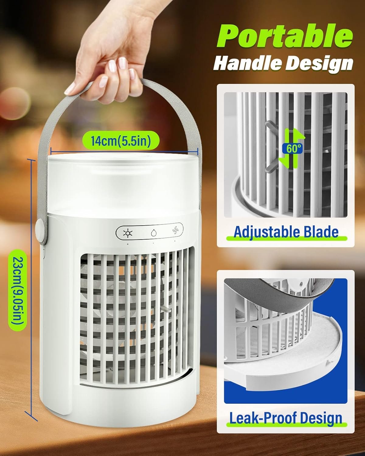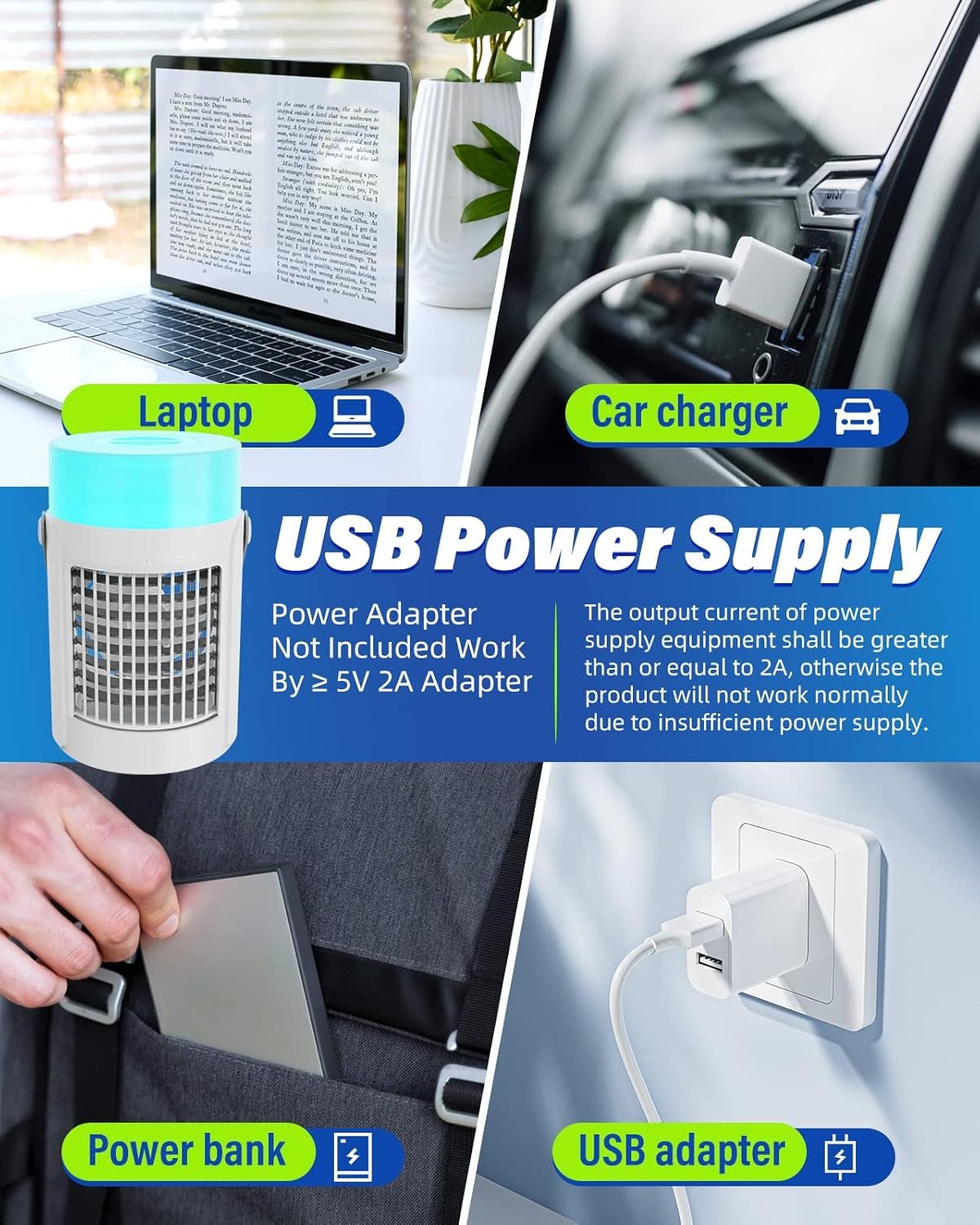 βπππππΌπ½ππ πΏπππππ & πΎπππ πΌππ ππππππππ πππ ππππΏ ππ: With a compact design and a convenient handle, you can easily carry this portable air conditioner to your bedroom, living room or elsewhere. With USB charging port,the mini air conditioner can be powered by power banks, laptops, car chargers and adapters(5V 2A adapter is recommended, not included, please keep connected to the power supply when using it).