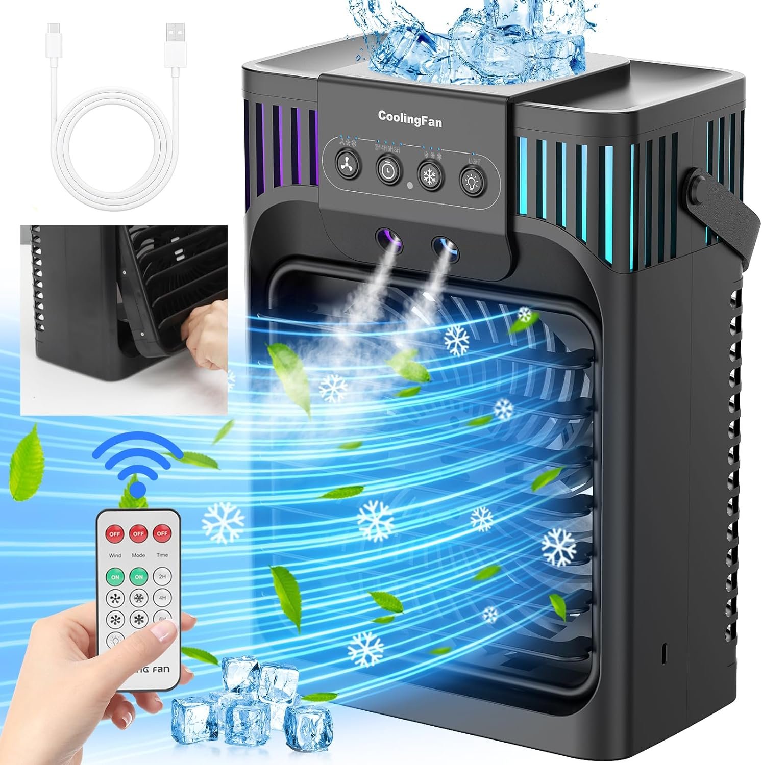 【Remote Control & Multi-Functional】Four-in-one design, it is not only a cute air cooler but also a table fan, humidifier, and led night lights. In addition, the Cooling fans have better atomization technology we developed that can reduce the noise to 34 decibels. The upgraded mesh structure enhances the filtering effect. Hope it gives you a good night’s sleep, The personal air conditioner fan comes with a remote control with a range of 16.4 feet, allowing you to easily adjust cooling mode, speed, and timer, and LED light from the sofa or bed. Portable design with a handle for easy carrying and space saving.