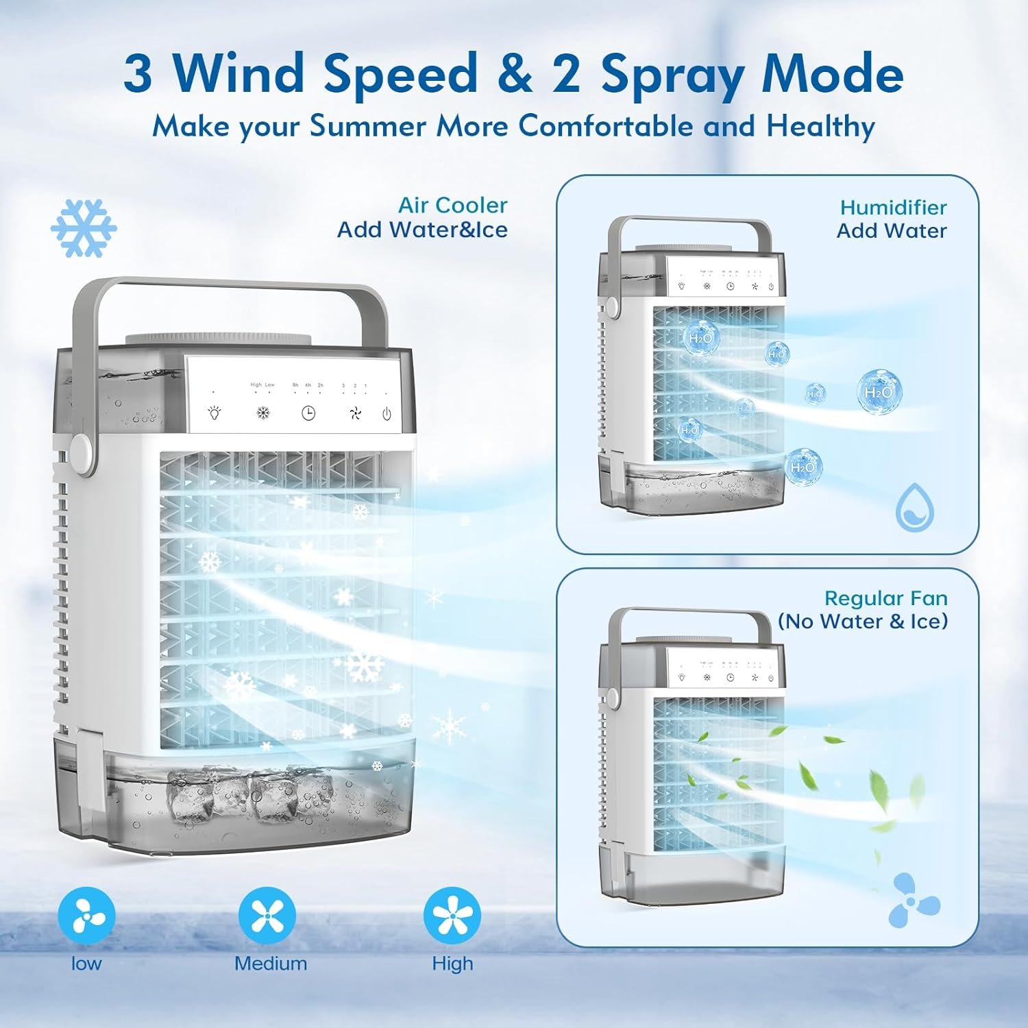 ❄ 【3 wind speeds & high,low/mist modes】 RCCVEI AC Fan has 3 wind speeds, high, medium and low, and there are two spray modes can be set, whether you want to cool down quickly or soft moisture, can meet your needs, make your summer life more refreshing and pleasant.