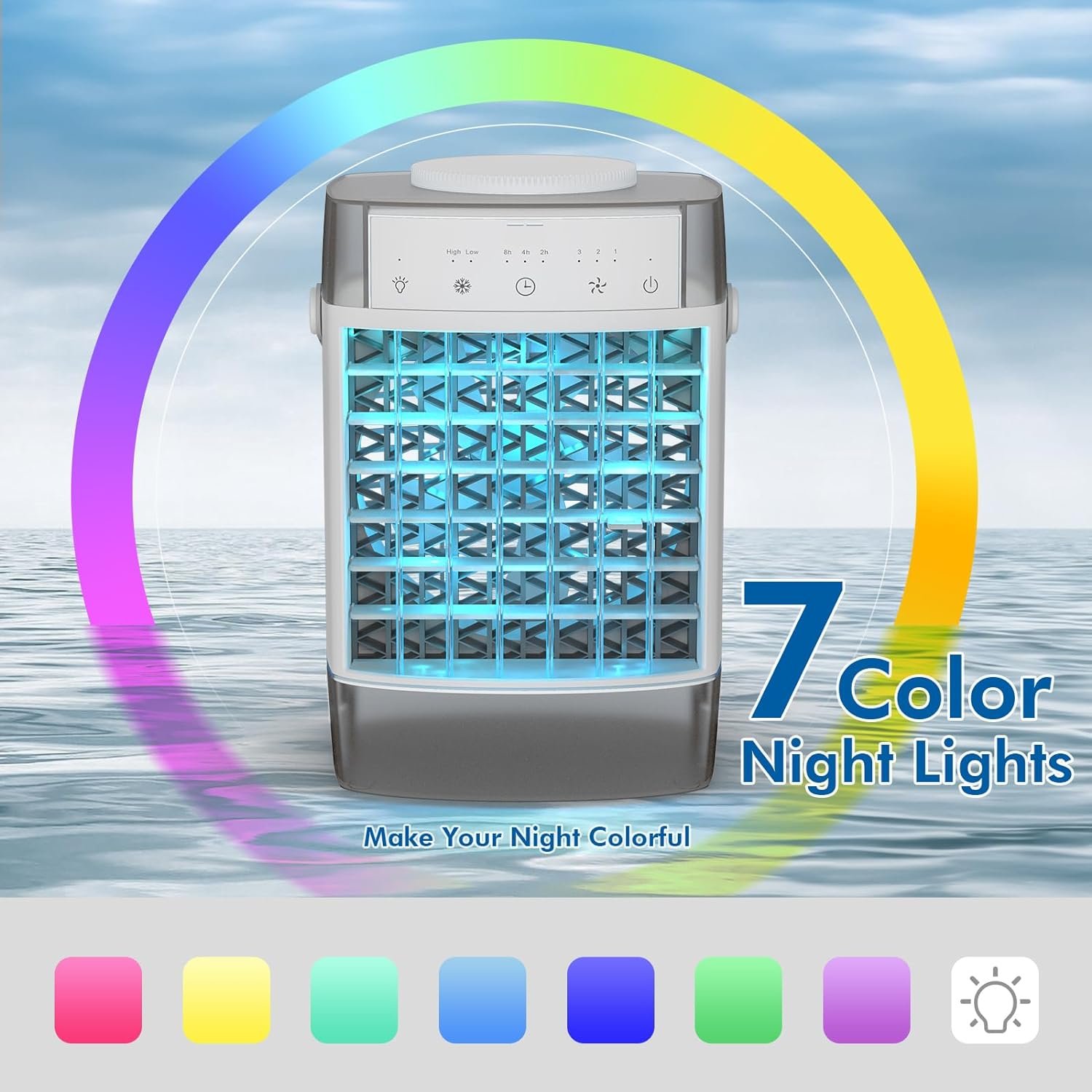 ❄ 【Colorful Night Light & Timing function】RCCVEI Evaporative Air Cooler has 7 kinds of night lights built in to match your mood, and has 3 timing gears of 2-4-8H, convenient adjustable wind direction up and down 60° to adjust to the best air flow direction for more comfortable enjoyment. As well as the air pipe design ensures the quiet operation of the air conditioner, it generates surprisingly low noise level. It’s only 50dB.