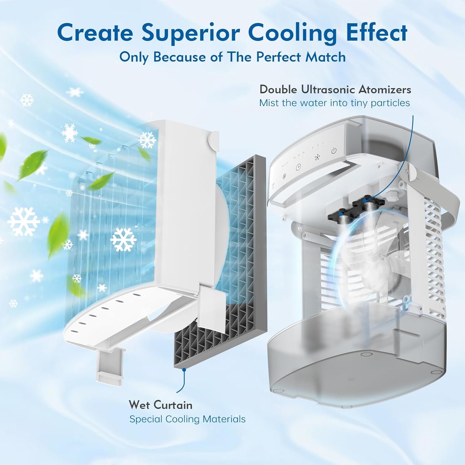 ❄ 【Double Tank Super Cooling】RCCVEI Mini Air Conditioner is equipped with dual water tanks, the upper layer is equipped with a powerful dual ultrasonic atomizer to produce tiny water particles, and the lower layer uses a wet curtain from which water evaporates to absorb heat, achieving rapid cooling and dispelling heat.