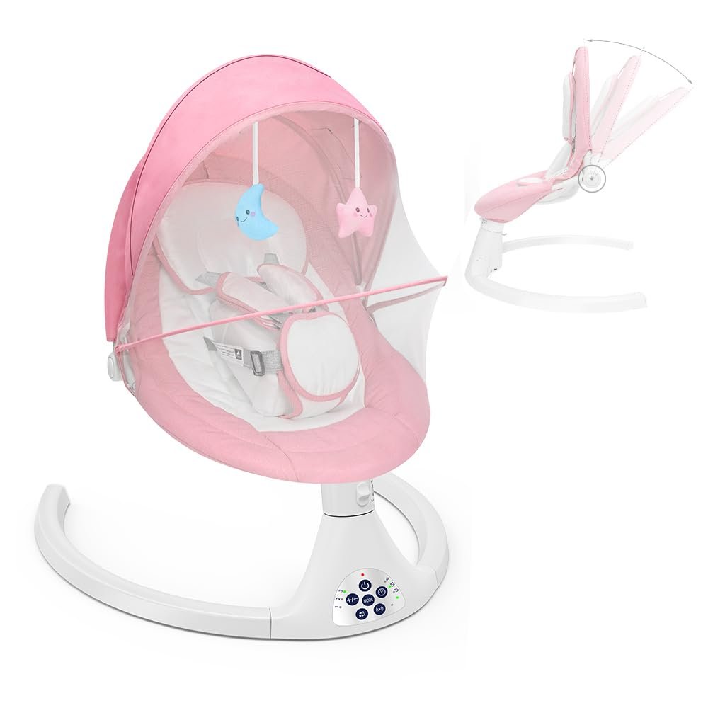 Portable Automatic Baby Swing, Suitable for Infants to Toddlers, 5 Swing Speeds, Powered by Standard Plug or Batteries, Remote Control, 5-Point Safety Harness, Pink 1