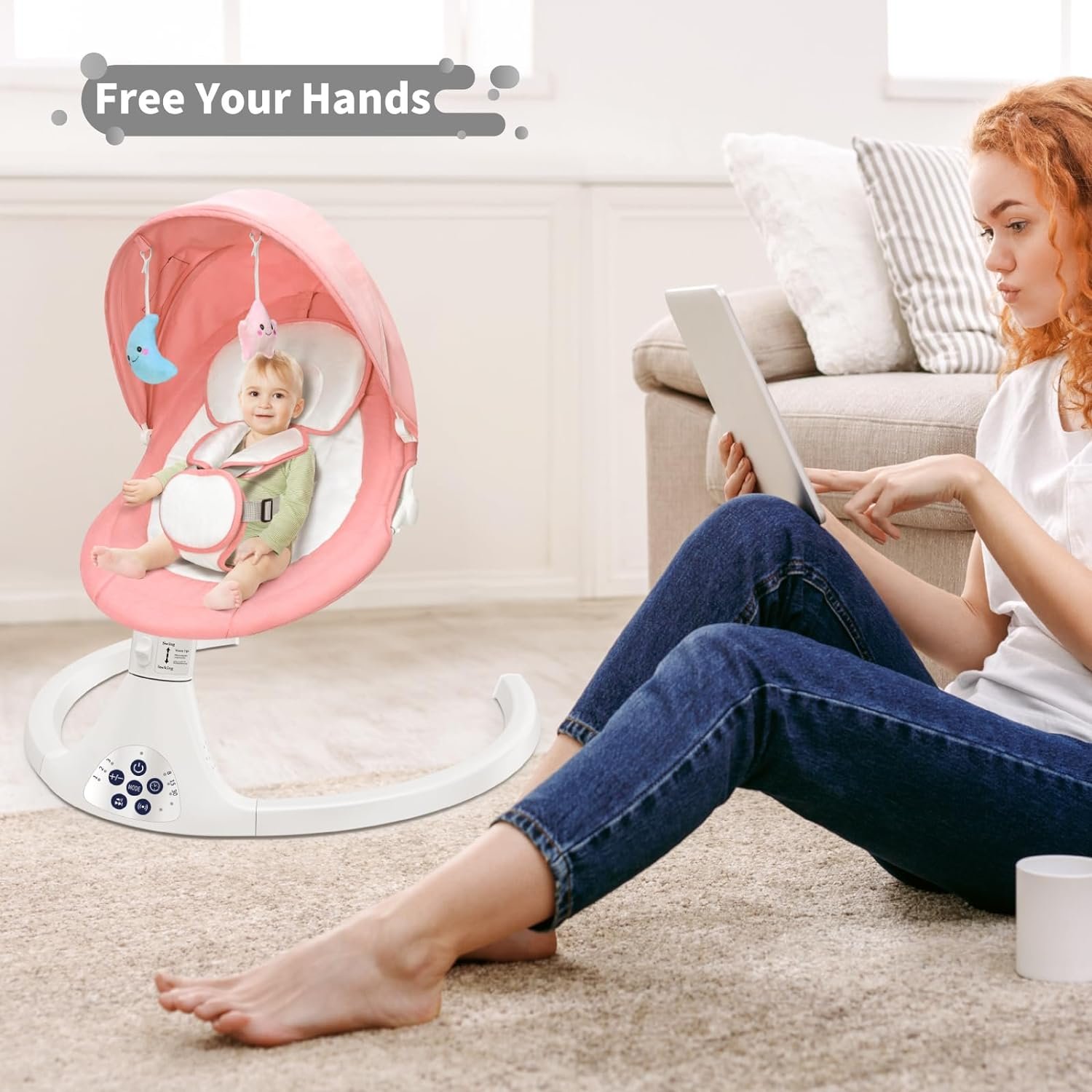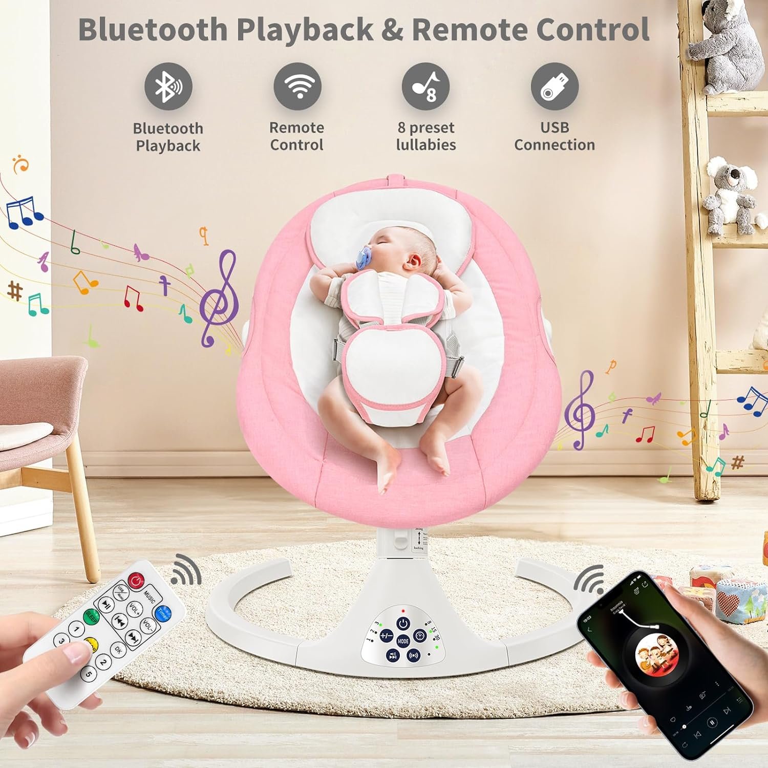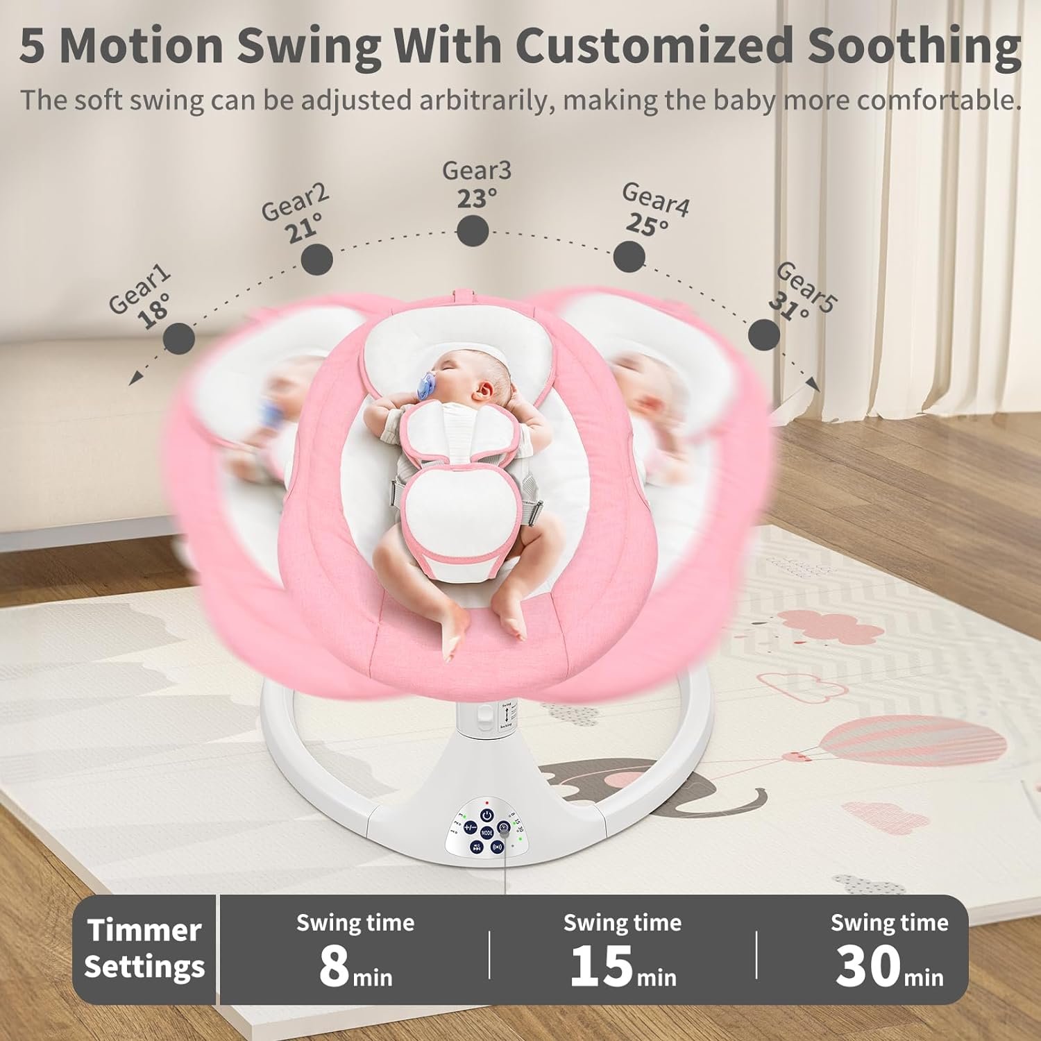 Easy to Use: Equipped with an intelligent and intuitive touch panel, this baby swing is easy to operate. It can also be controlled remotely with a remote control, providing you with greater convenience.