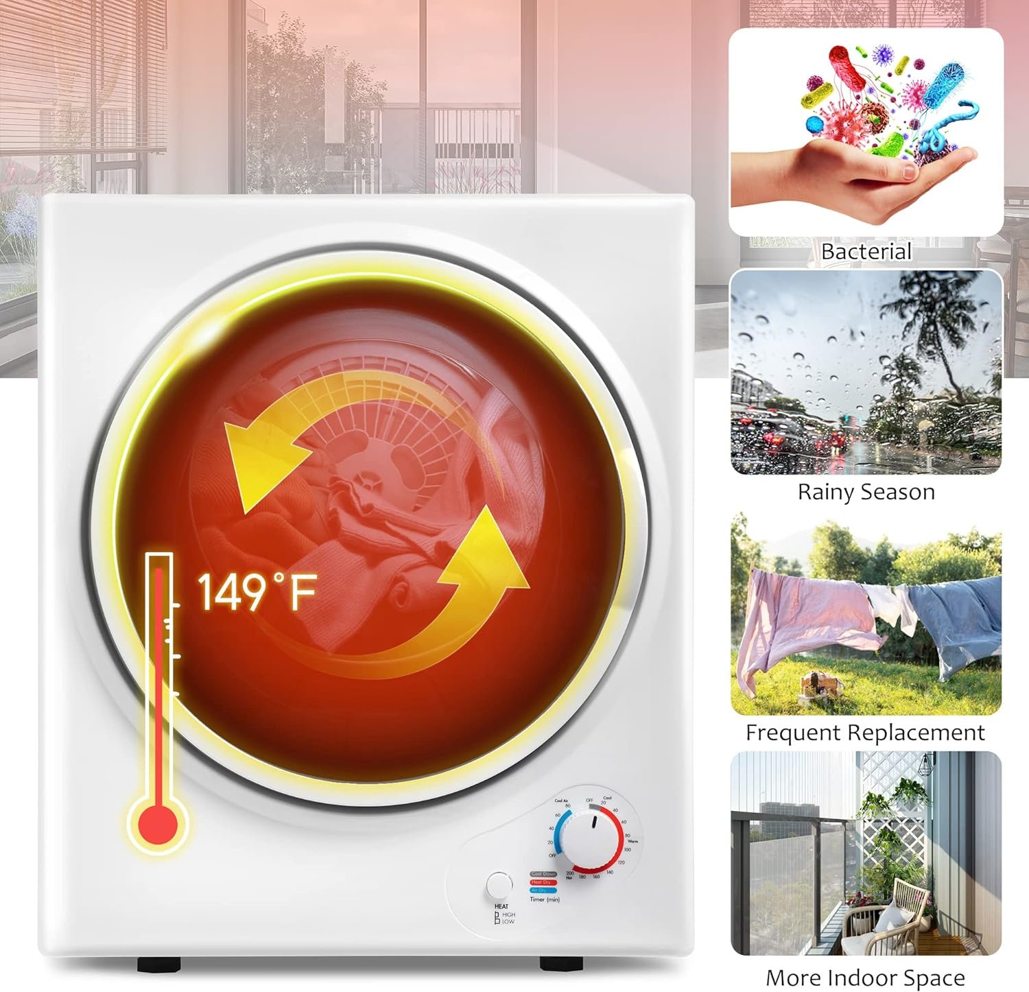 Featuring large-diameter stainless steel tumble, this portable laundry dryer adopts the forward and reverse tumble action with inner device for easy rotation to prevent tangling, effectively removing wrinkles and restoring the fluffy and comfortable fabrics in the moderate temperature.