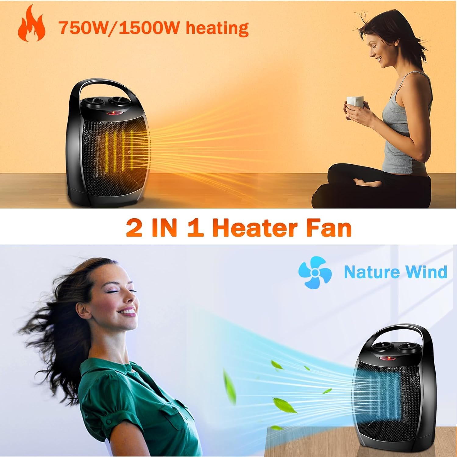 2 IN 1 HEATER FAN: 1. High Heat (1500-watt), 2. Low Heat (750-watt ), 3.Fan only for summer. You can use it both for winter and summer. Thermostat control of the heater will turn the heater off when it reaches a preset temperature and turn the heater back on when the temperature dips below the thermostat setting