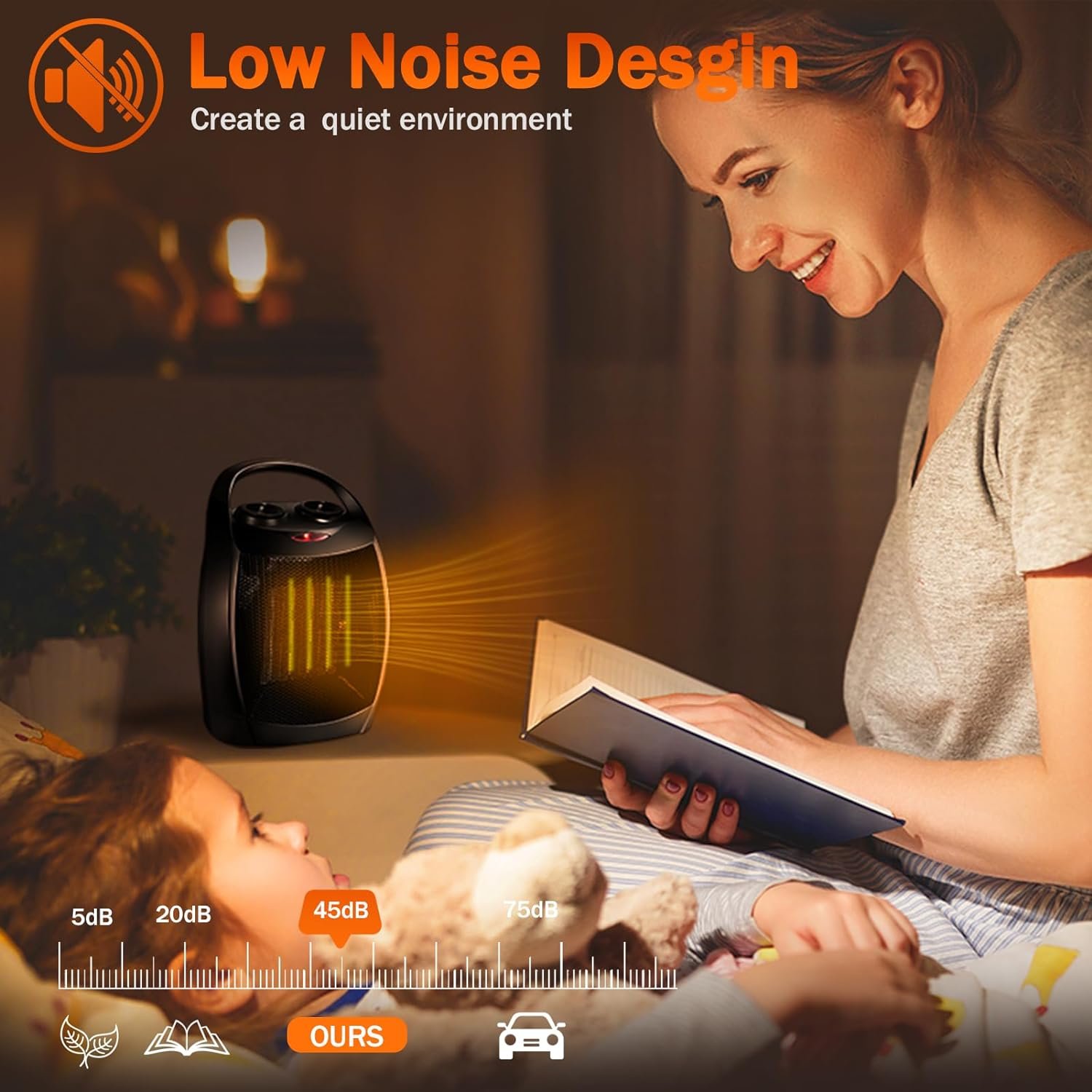 QUIETER DESIGN: This space heaters for indoor use is equipped with a brushless DC motor and a construction of 5 aerodynamic blades. These features result in smooth airflow, eliminating air turbulence and providing gentle, peaceful warmth. With noise levels lower than 45 decibels, it is sufficiently quiet, making it suitable for most individuals to use in their bedrooms for sleeping or working.