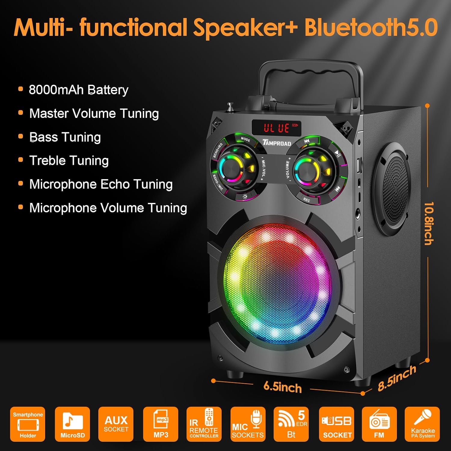 ♫[Big Loud Bluetooth Speakers]Large capacity battery & Bluetooth 5.0: The powerful long-life 8000mAh battery technology Supports long play time and colorful light show.Bluetooth 5.0 technology can freely and easily connect your Bluetooth speaker to your smart phone(connection range of 100 feet), including other Bluetooth-enabled devices compatible. The 3.5mm audio aux cable is wired to smartphone, MP3, MP4, Computer, PC, TV and other non-Bluetooth devices with 3.5mm audio jack.