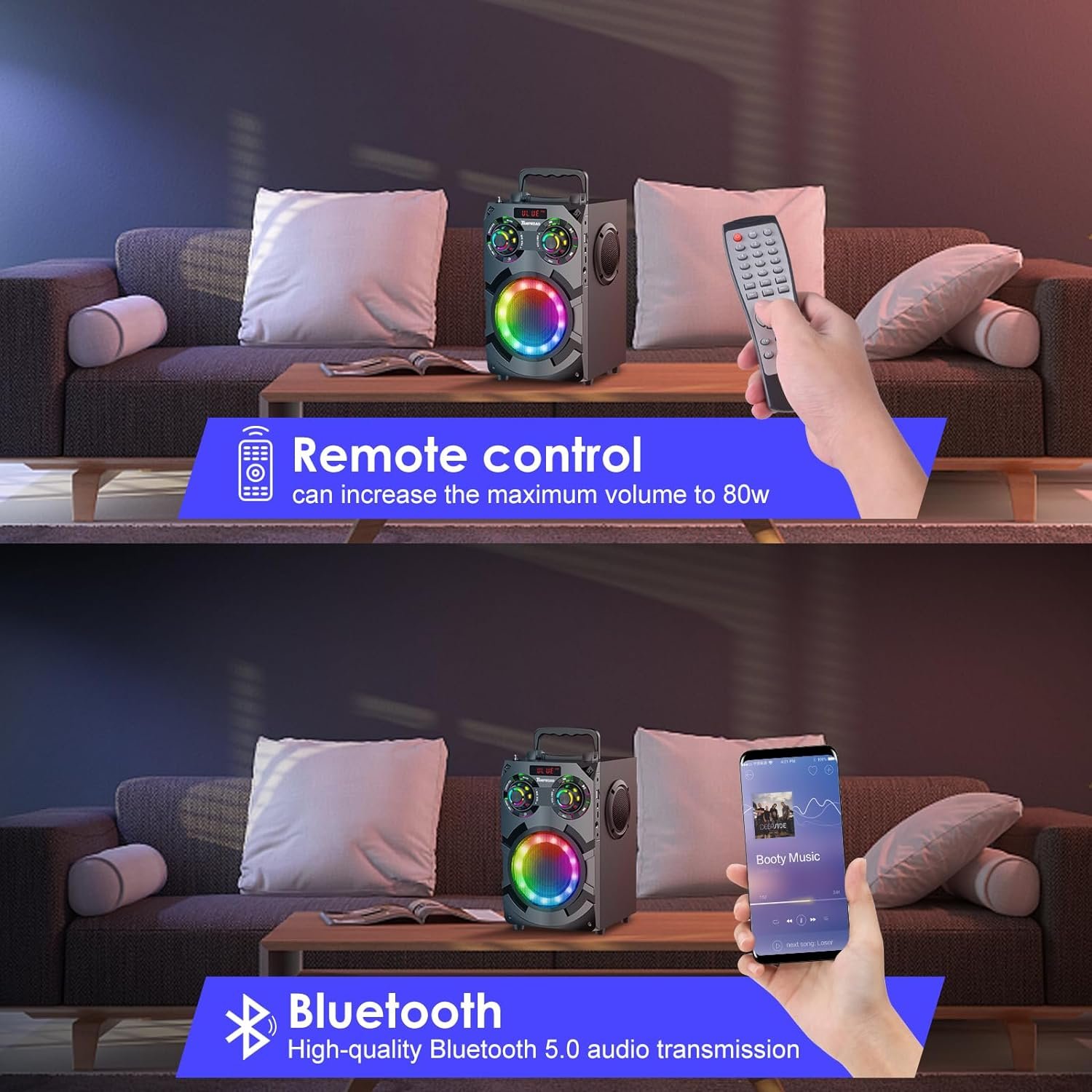 ♫[Wireless Party Speakers]Sound upgrade & Beats Driven Light Show :We can increase the volume of the A33 wireless speaker from 60W to 80W through the remote control – through the Treble Tuning button. A33 can display more than 10 lighting effects that jump with the rhythm, and your heart beats wildly with the music, your party will more shine.Let’s start preparing for chrismas vacations and various parties!
