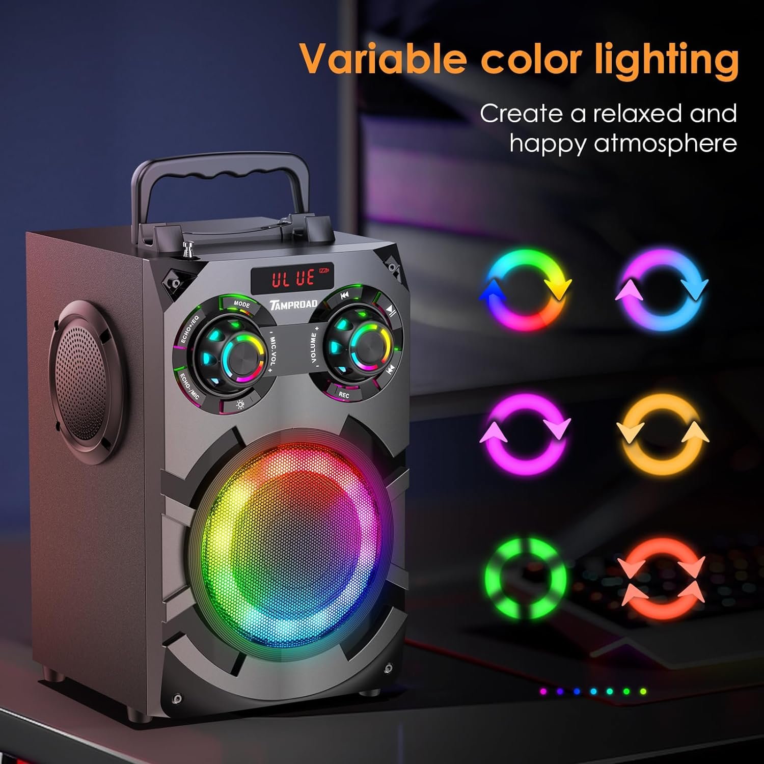 A33 Bluetooth Speaker is a Powerful Party Speaker with Booming Bass, Crystal Clear Treble, and Colorful Light Effects.