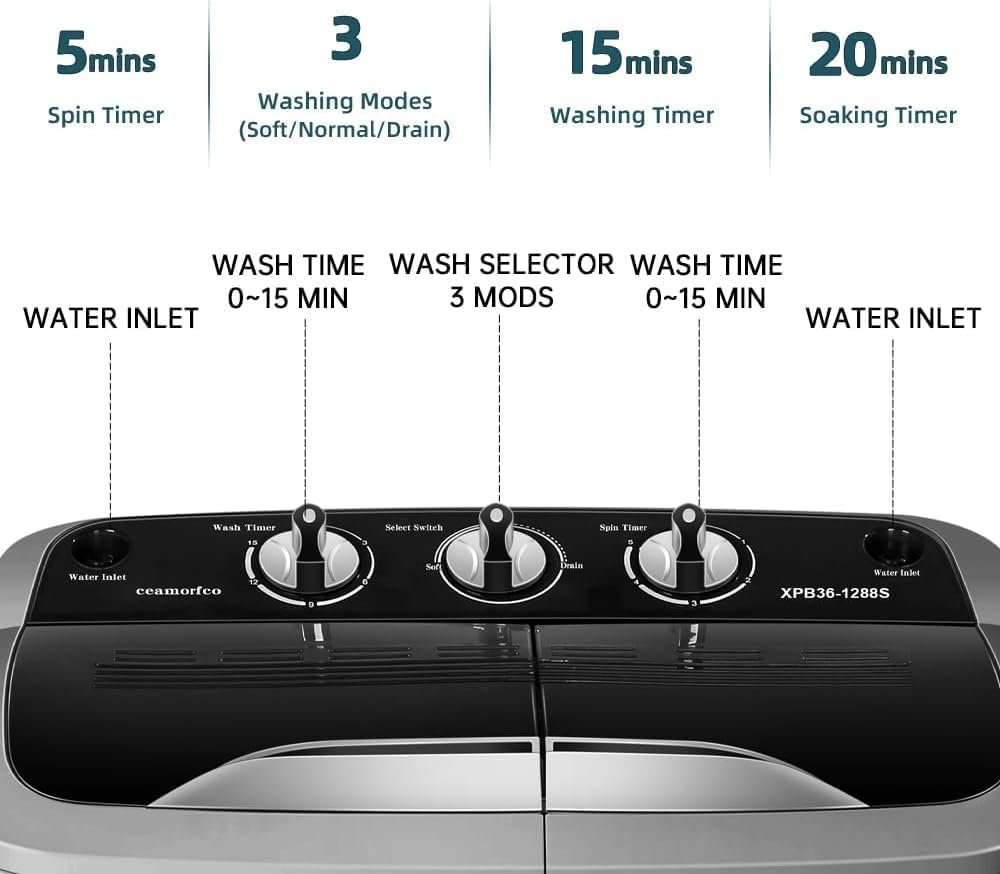 š”ćIndependent Time Controlć: The washer control timer runs up to 15 minutes, while the spin cycle timer runs up to 5 minutes per load, you can operate the washer or dryer independently according to your different needs. 3 different washing methods can meet your washing needs, convenient, gentle, normal washing and dehydration
