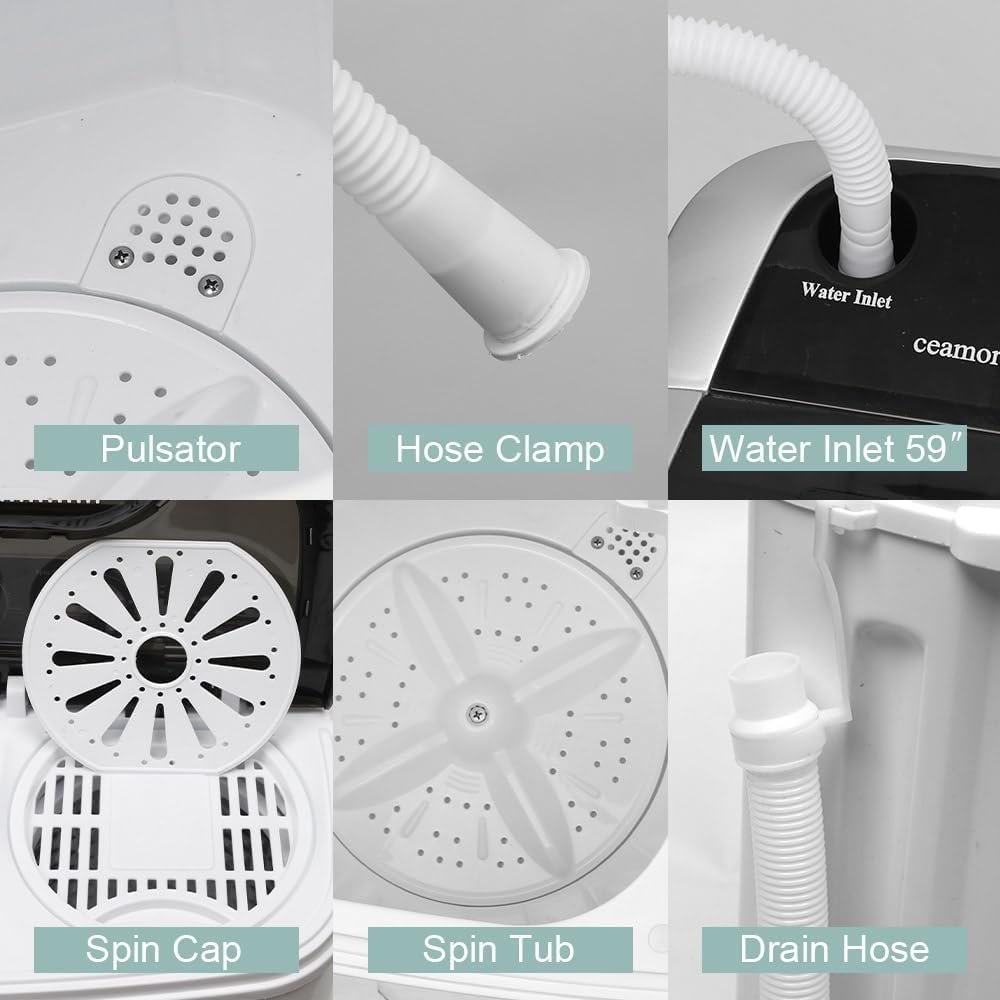 š”ćPowerful Performance & Drain Pumpć: This portable washing machine is equipped with a powerful 1500RPM motor with a maximum frequency of 60HZ, allowing the double-tub washing machine to clean your clothes in a short time. At the same time, the washing machine is equipped with a drain pump and a water pipe, which allows you to discharge the dirty water after washing to the place you want