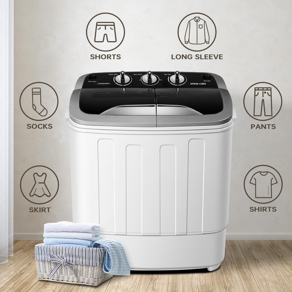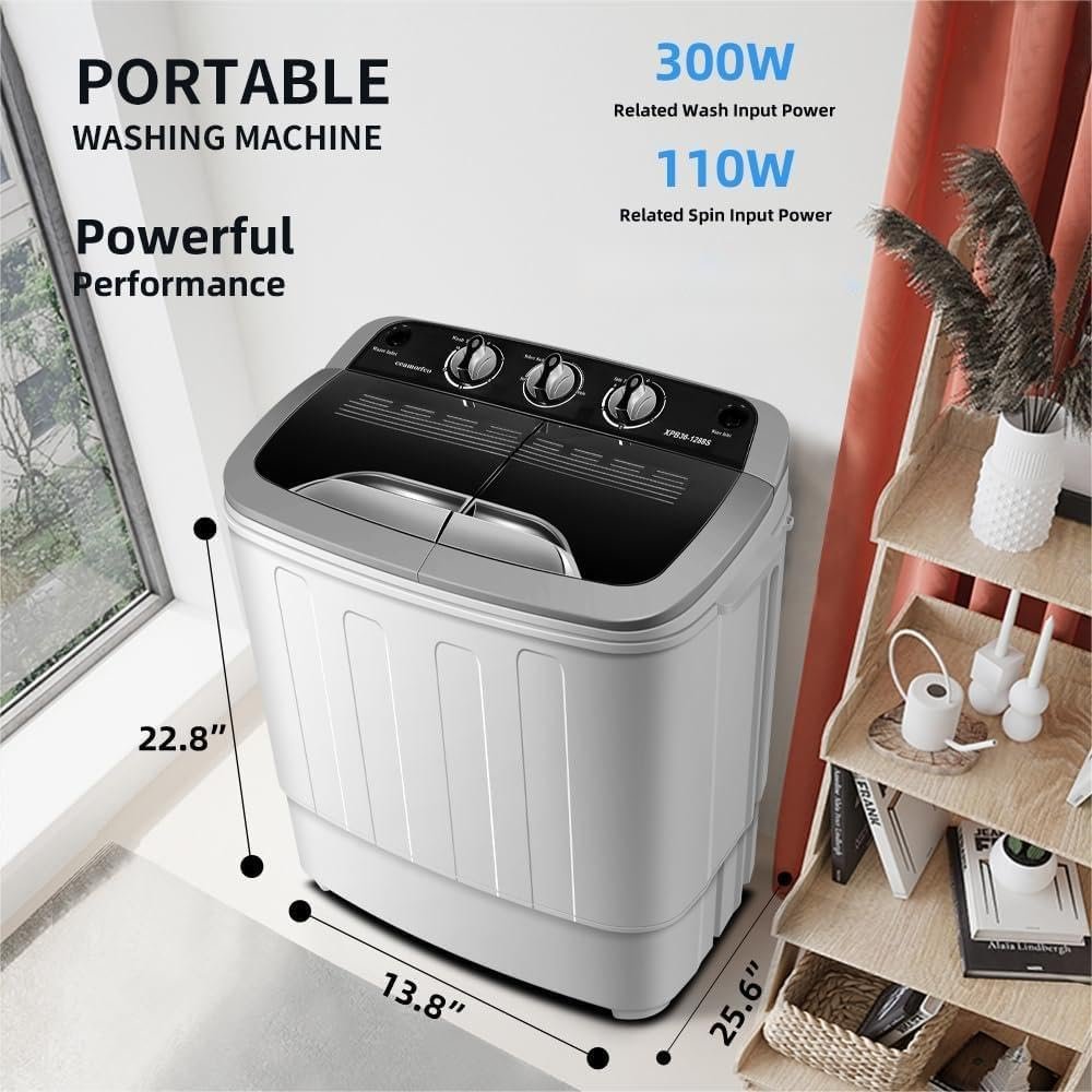 š”ćLarge Capacity and Compact Designć: The mini compact washing machine adopts a double-tub dual-function design, which can help you wash and spinning dry loads at the same time, and the integrated design of washing and spinning dry loads saves the space in your room. At the same time, the large-capacity body allows you to wash 10.5 pounds and spinning dry loads 7.5 pounds of clothes at a time