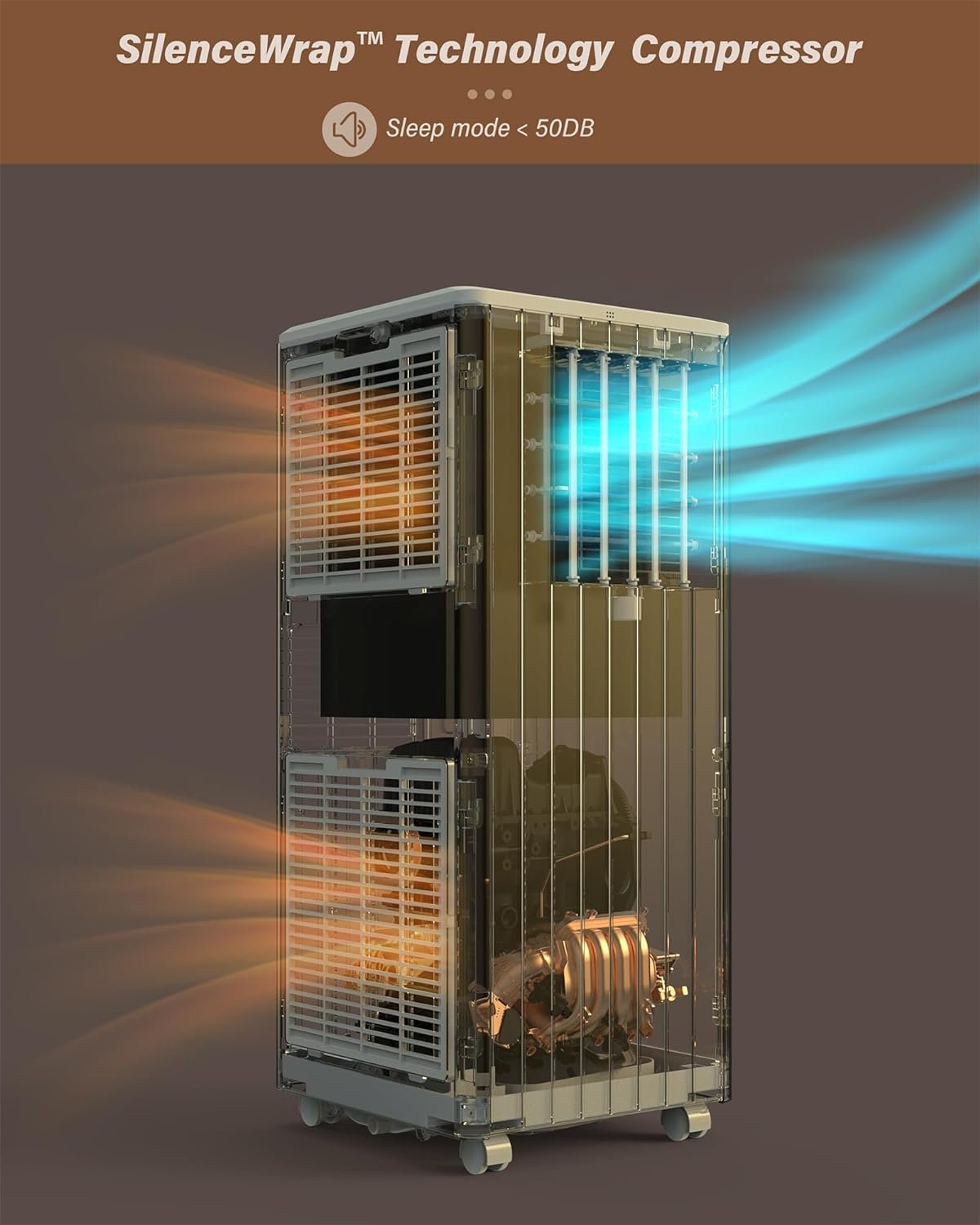 【Quiet Sleep Mode & 24H Timer】: The noise of room air conditioners is about 50db in normal cooling mode, This portable air conditioner helps you create a comfortable environment where you can work, meditate, sleep, or relax. You can also preset on/off after 0.5-24 hours, all these functional modes are energy-saving and smarter.
