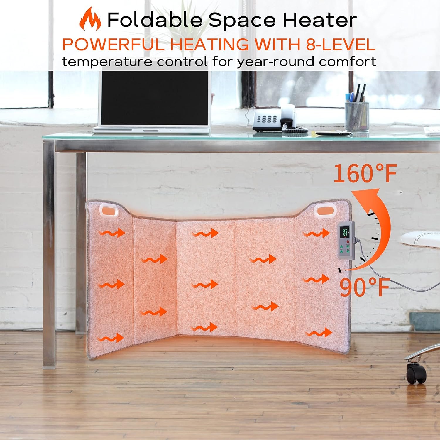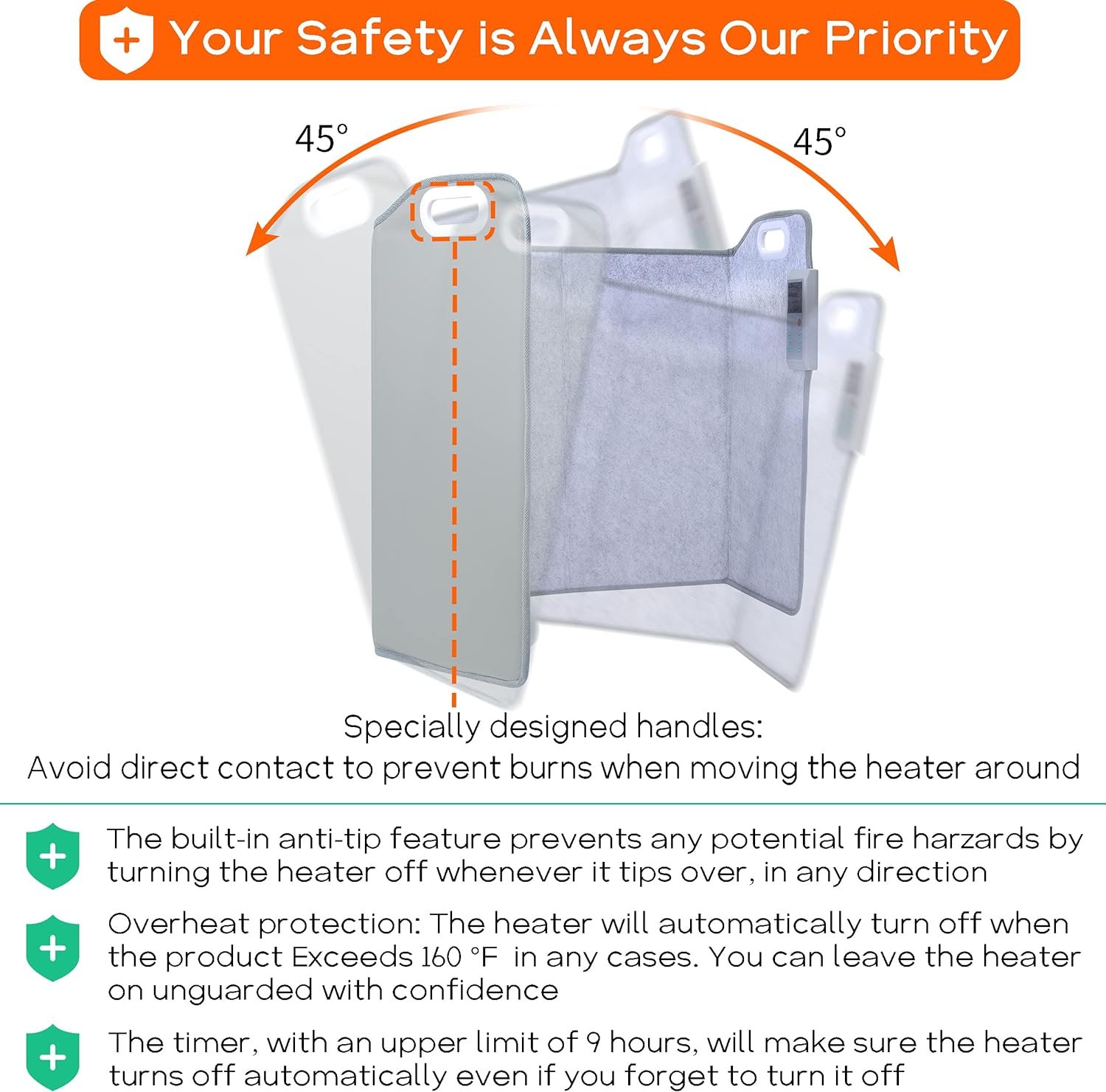 Personal Space Heater: The foldable stand up warming mat is small and compact, and silent, so it is easy to use anywhere! It’s flat, slim, and lightweight with a handle so you can use it at work, in your dorm or studio, your house, or even a tent.