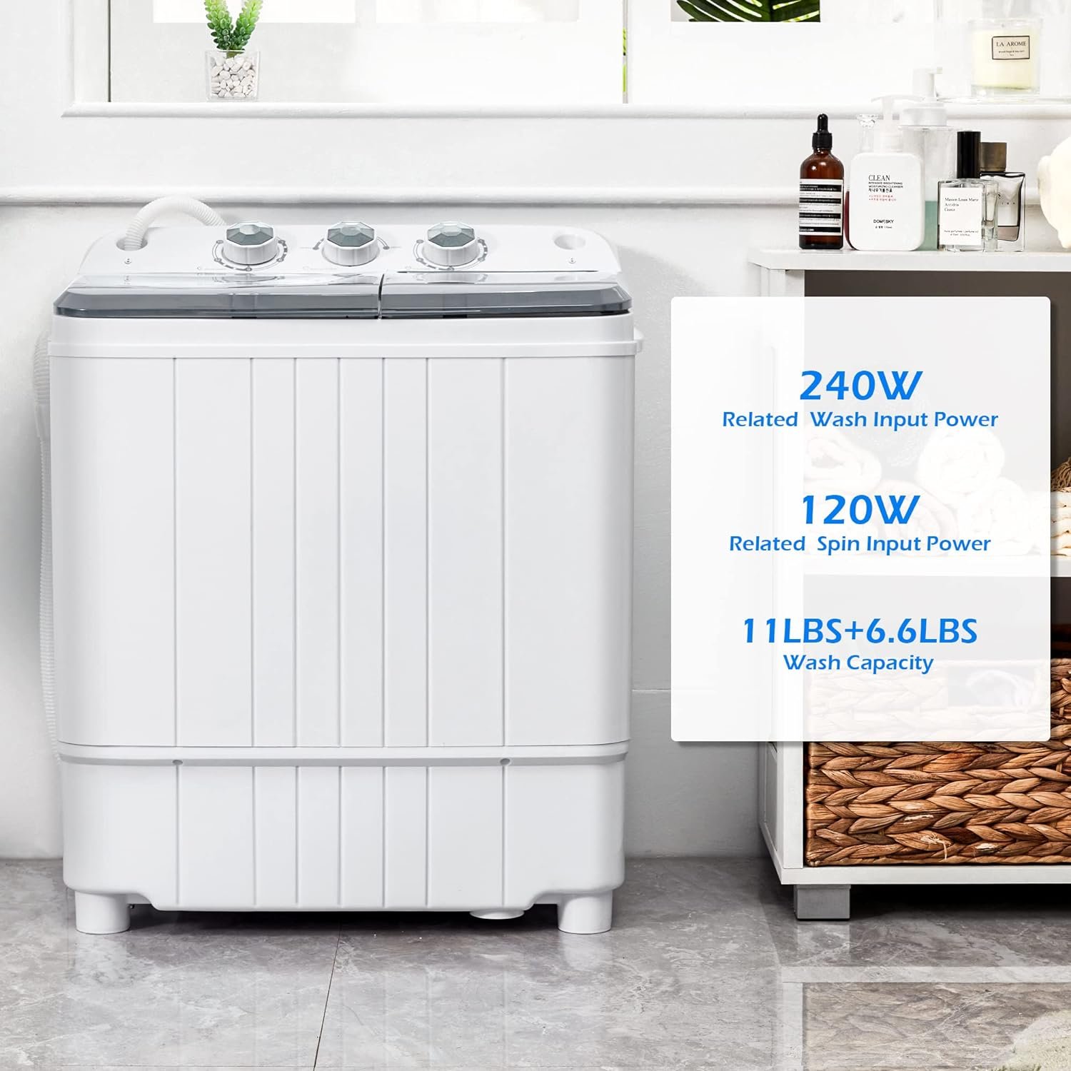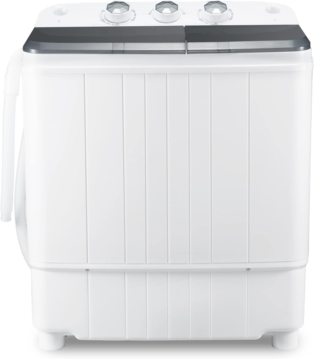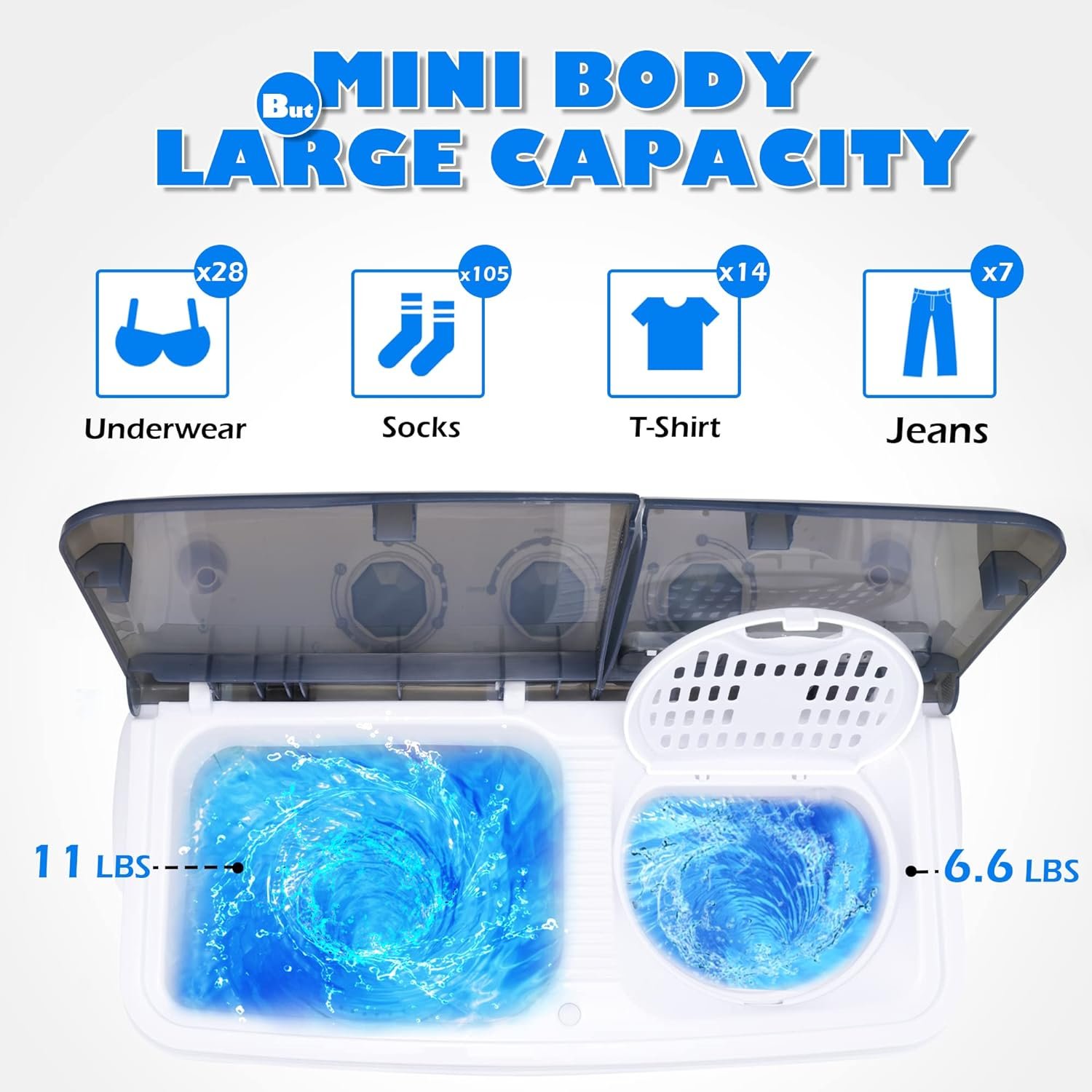 👕【Twin Tub And 17.6LBS Capacity】:The washing machine has twin tub design for both cleaning and drying,saving your valuable time. With 11 lbs wash capacity and 6.6 lbs spin capacity,the washer is perfect for washing daily laundry quickly.Moreover, transparent cover allows you to check the washing/spinning process at any time. Constructed of High-density plastic body+ Aluminum pump+ Upgraded motor, it is well built for years use.