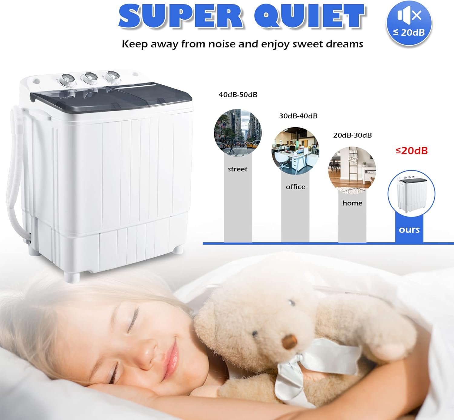 👙【Separate Time Control & Noise Reduction】:The washer and dryer has separate timer control, which make laundry washing more convenient and efficient.The washer control timer runs for up to 15 minutes while the spin cycle timer runs for up to 5 minutes for each load. Its noise is under 20 dB, which is quiet enough for you to run the machine even at night.All the washers passed the noise test, so that it will not disturb your life when use it.