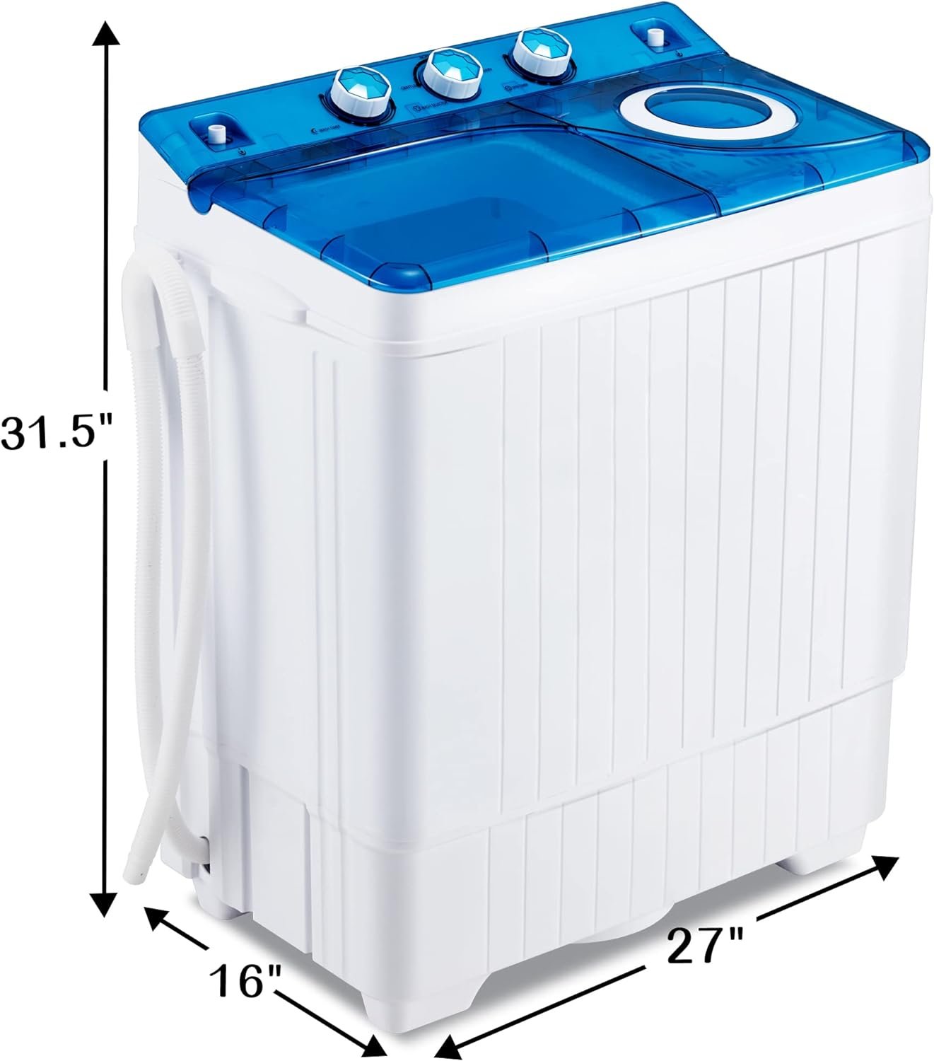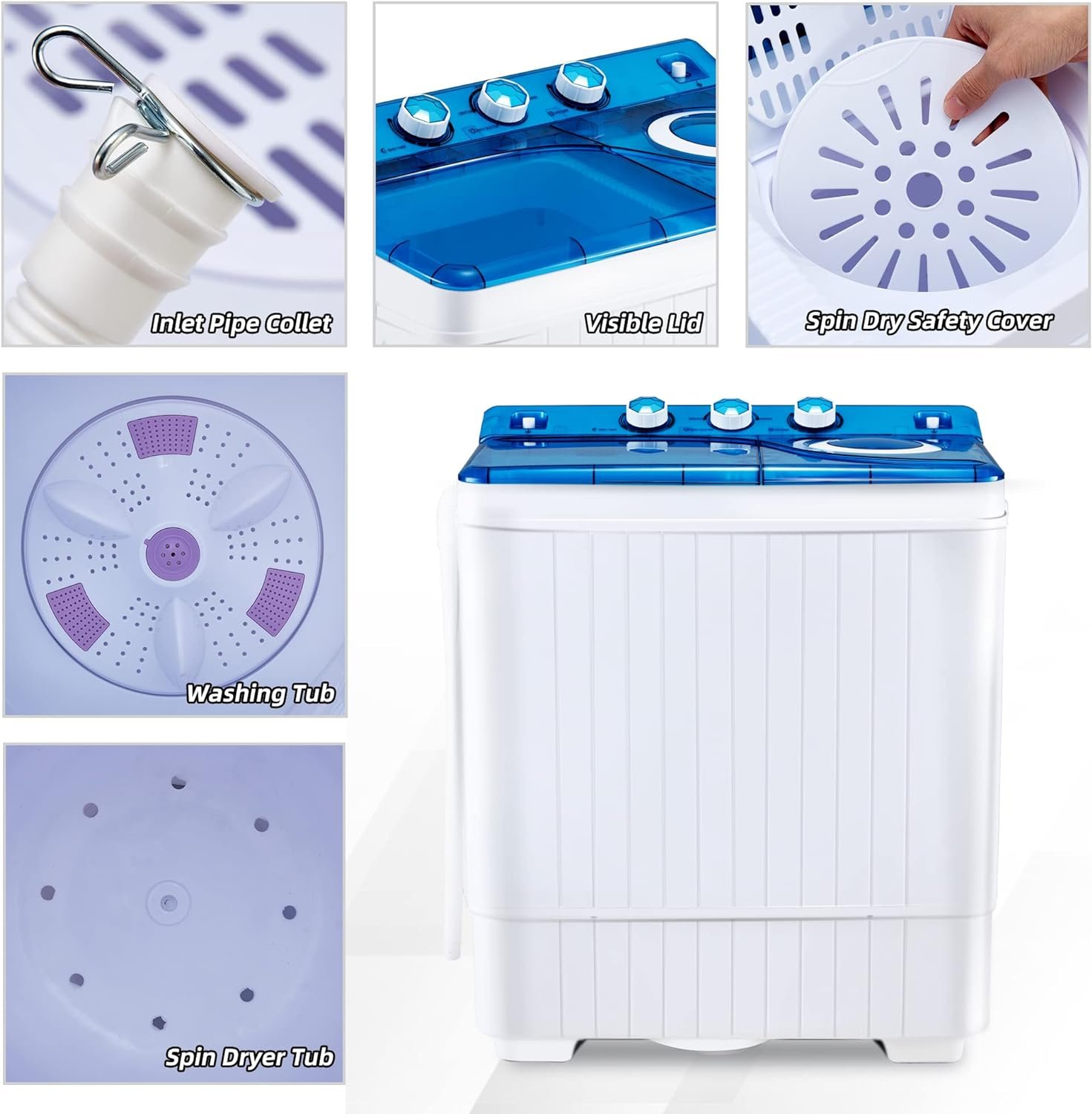 Dual motor: 280W washing power and 140w spinning power Washing tub(18lbs) and spining tub(8lbs) meets daily laundry needs Separate washing and drying functions can be controlled by different timer switches Detachable lint filter better collects lints in water Built-in drainage pump and extended drainage hose to quickly drain water
