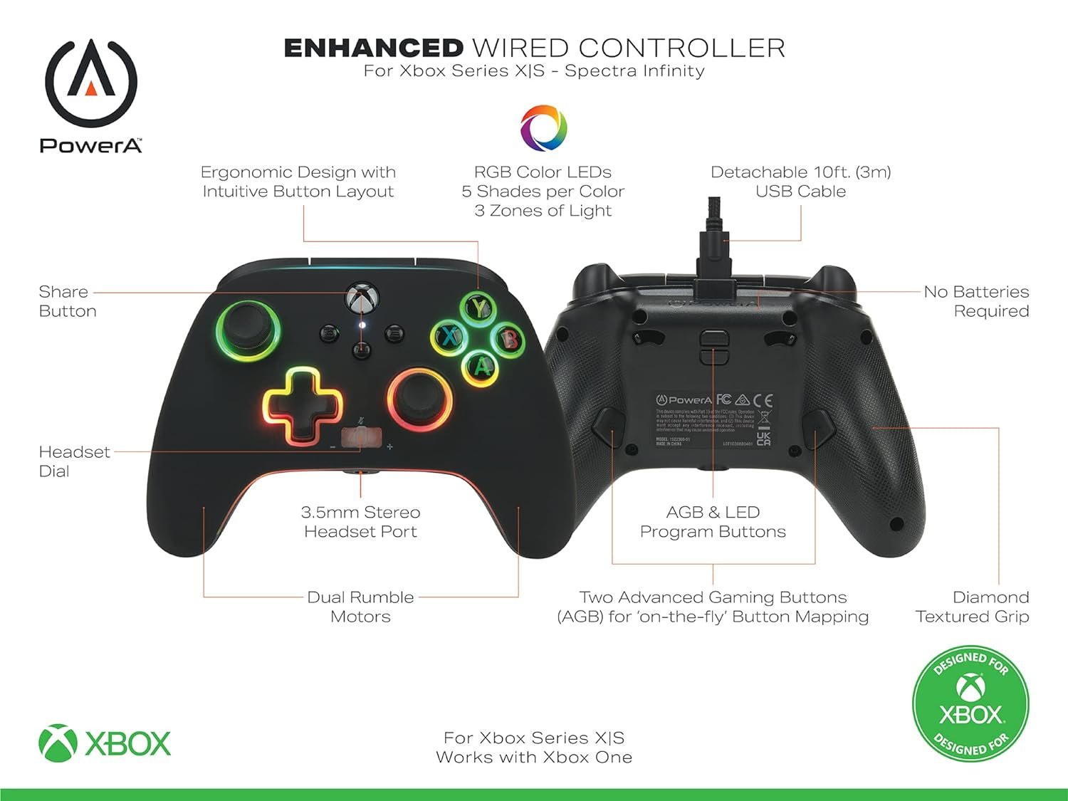 Twenty different colors and tons of vivid combinations across three distinct Spectra Zones.The Spectra Infinity Enhanced Wired Controller for Xbox Series X|S has everything you need. Featuring the Xbox Share Button, a Volume Dial with one-touch Mic Mute, two embedded anti-friction rings and a 3.5mm audio jack, you’ll enjoy a complete gaming experience. Crystal-clear stereo sound and intuitive controls make in-game communication a breeze. Play from anywhere in the room with the braided 10-foot cable featuring a snap-lock connector and inline release.Officially licensed for Xbox Series X|S and works on Xbox One and Windows 10/11. Two-year limited warranty – visit PowerA.com/Support