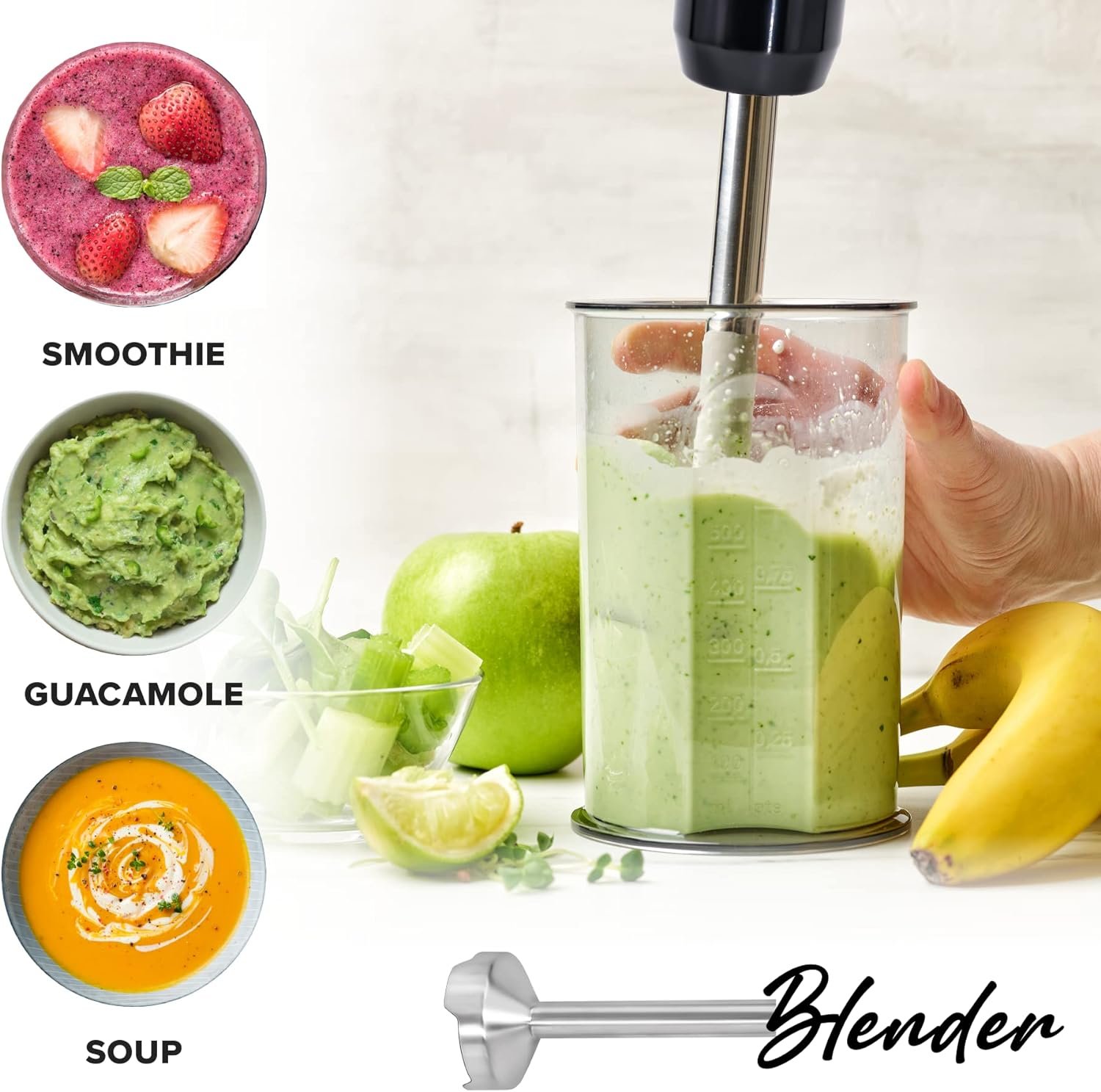 1 Blender: Soup & Smoothies 2 Chopper: Meat, Nut, Salsa 3 Whisk: Egg, Whipped Cream 4 Frother: Latte, Powder