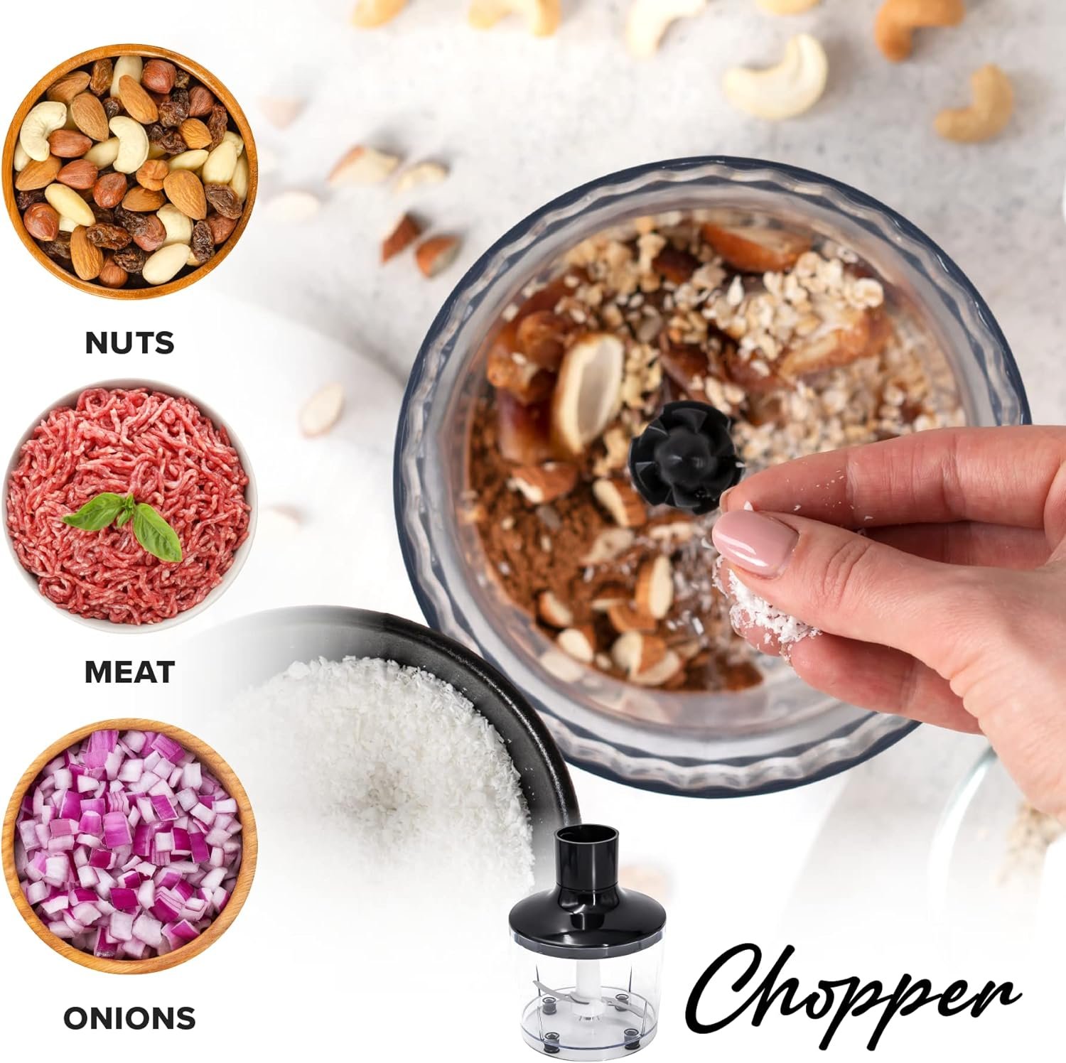 Please put ingredients chopped into small pieces for a better use experience. It’s perfect for meat, cheese, veggies, walnuts, almonds, etc. Don’t chop extremely hard food, for example ice cubes, coffee beans, and grains.