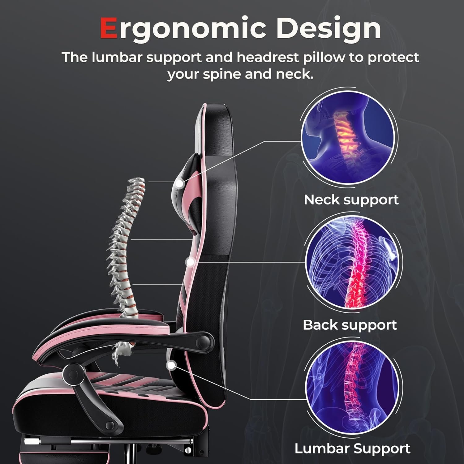 【Most Comfortable And Relaxing】The reclining gaming chair filled with high-density sponge, and the surface is covered with high-quality PU leather. The backrest provides multi-point support and equipped with a freely adjustable waist pillow and head pillow to perfectly fit your spine which help you release the lumbar pressure and provide ultimate comfort.