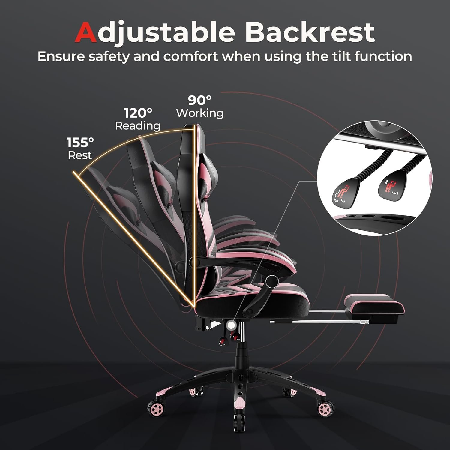 【Adjust at Will】The seat height adjustment range of the ergonomic gaming chair is 17 inches to 20 inches, which can meet your daily needs. The adjustment range of the backrest is 90 degrees to 155 degrees which can be tilted to a position suitable for work, watching TV or rest. The multi-functional game chair can enhance your game experience.