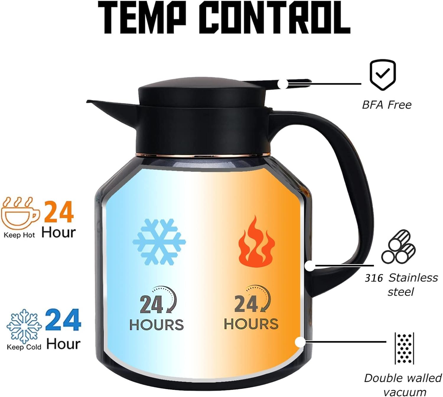 316 Stainless steel Vacuum jug interior and 304 Stainless steel exterior thermal design, allows for maximum temperature retention.