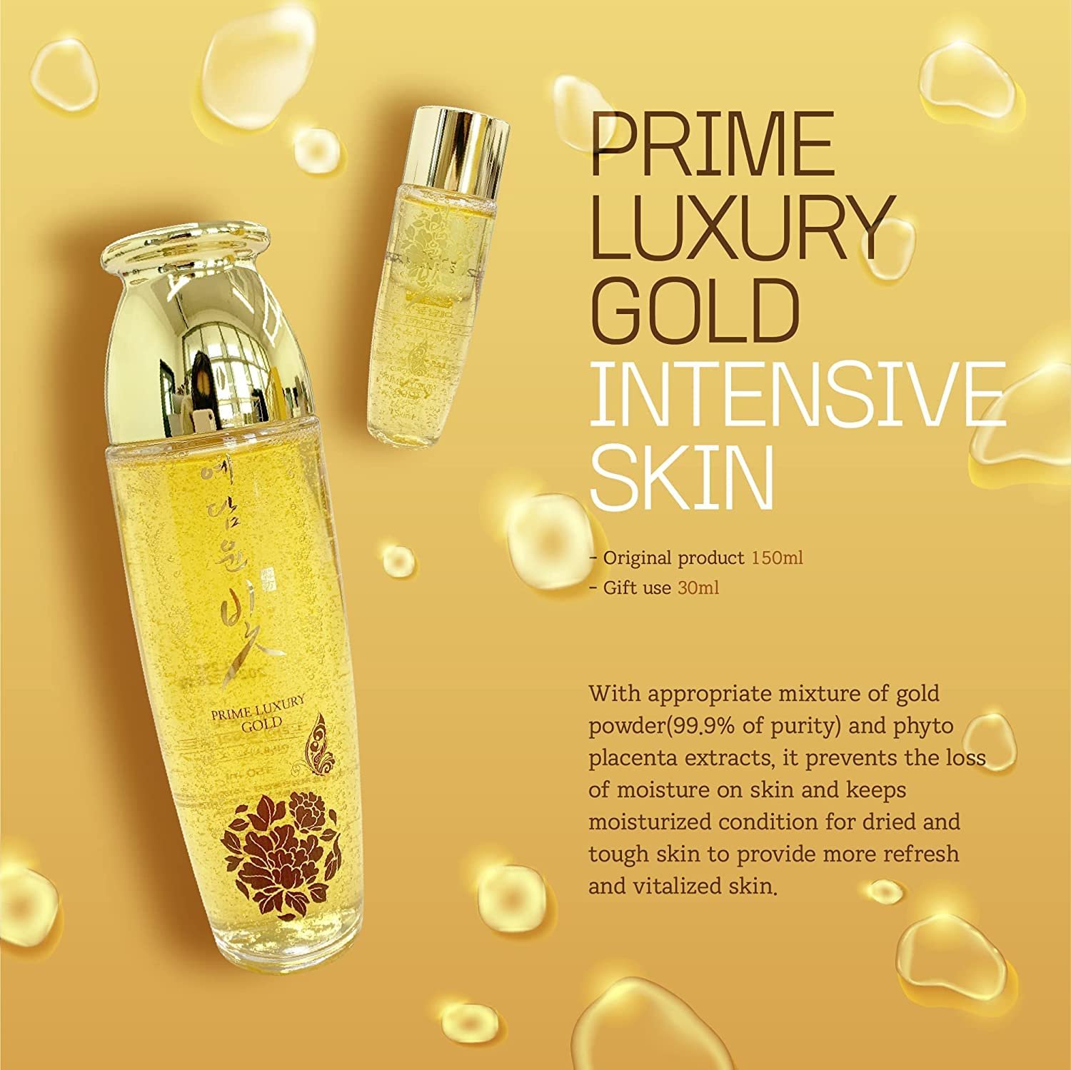 Prime Luxury Gold Intensive Skin: With appropriate mixture of gold powder(99.9% of purity) and phyto placenta extracts, it prevents the loss of moisture on skin and keeps moisturized condition for dried and tough skin to provide more refresh and vitalized skin.