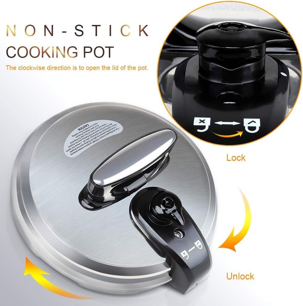 6QT Non-Stick Cooking Pot : Removable cooking pot is made from food grade 304 stainless steel, chemical-free non-stick coating, no need to worry about health. The gasket creates a fully sealed environment that captures the flavour, nutrients and aromas of the food. Suitable for a family of 4 to 6.