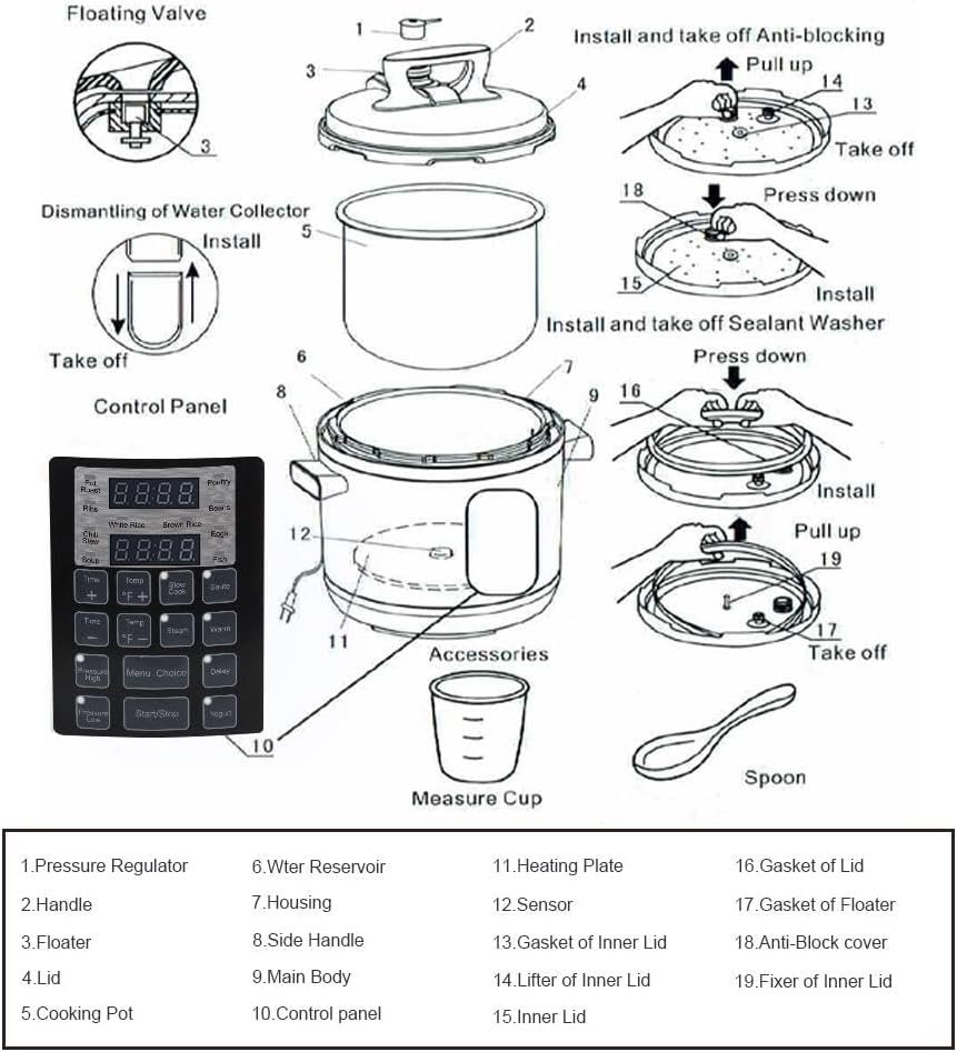16 Smart Programs : Pressure Cook, Pot Rroast, Ribs, Whole chicken, Chili/Stew, Soup, White Rice, Brown Rice, Beans, Egg, Yogurt, Slow Cook Low, Slow Cook high, Sauté/Brown, Reheat, Keep Warm. No need for cumbersome operations, just a few simple steps to cooking delicious food.