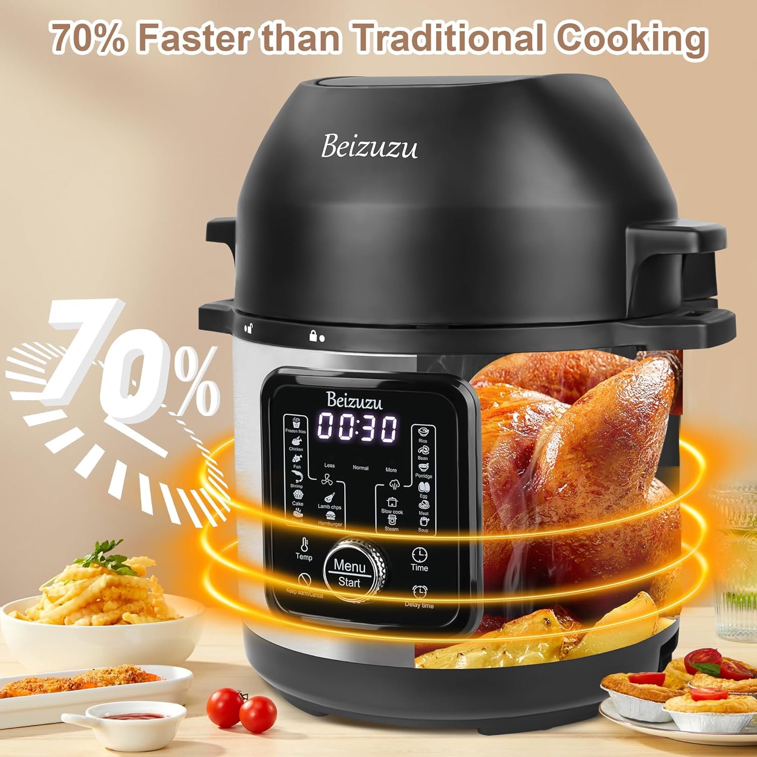 【70% Faster Cooking & 24H Appointment Function】: The air fryer pressure cooker meals up to 70% faster than traditional cooking methods or use the Slow Cook function for stews and soups. 24-hour delay timer makes it possible to prepare your breakfast in advance at night and enjoy it in the morning. The LED display shows clearly the cooking progress.