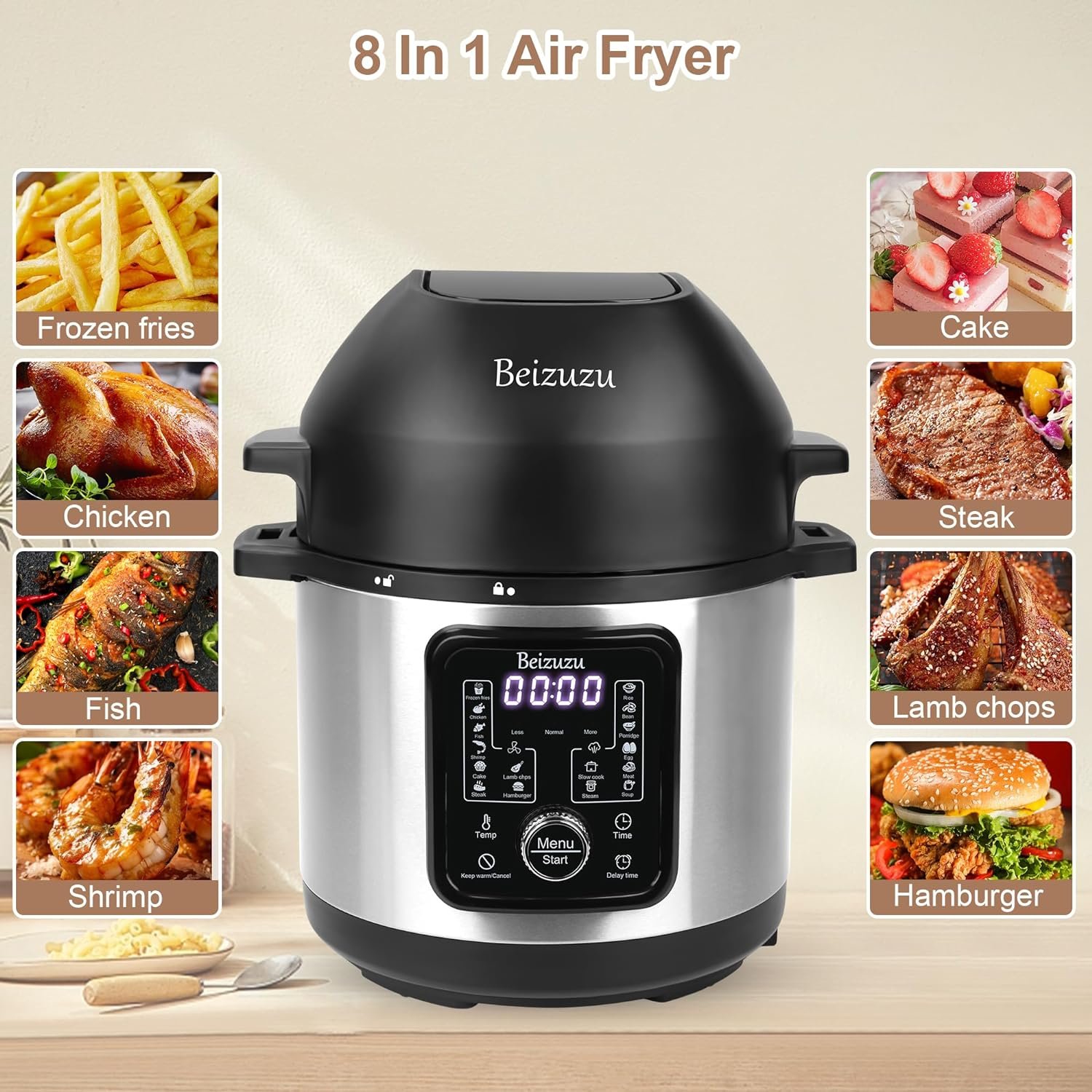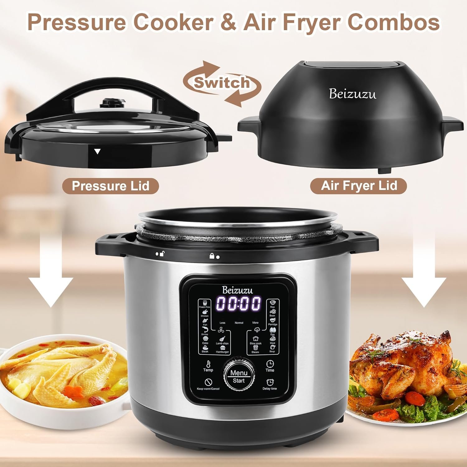 【All-In-1 Multi-Function Cooker】: Our pressure cooker air fryer combo come with 2 detachable lids that allow you to use it as an Air Fryer, Pressure Cooker, Slow Cooker, Rice Cooker, Egg Cooker, Steam Cooker, Soup Cooker, and much more. You can make all the delicious recipes you want.