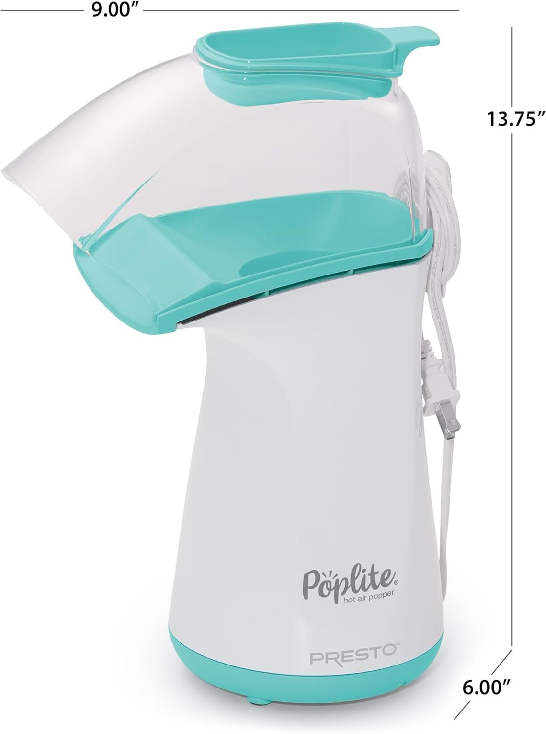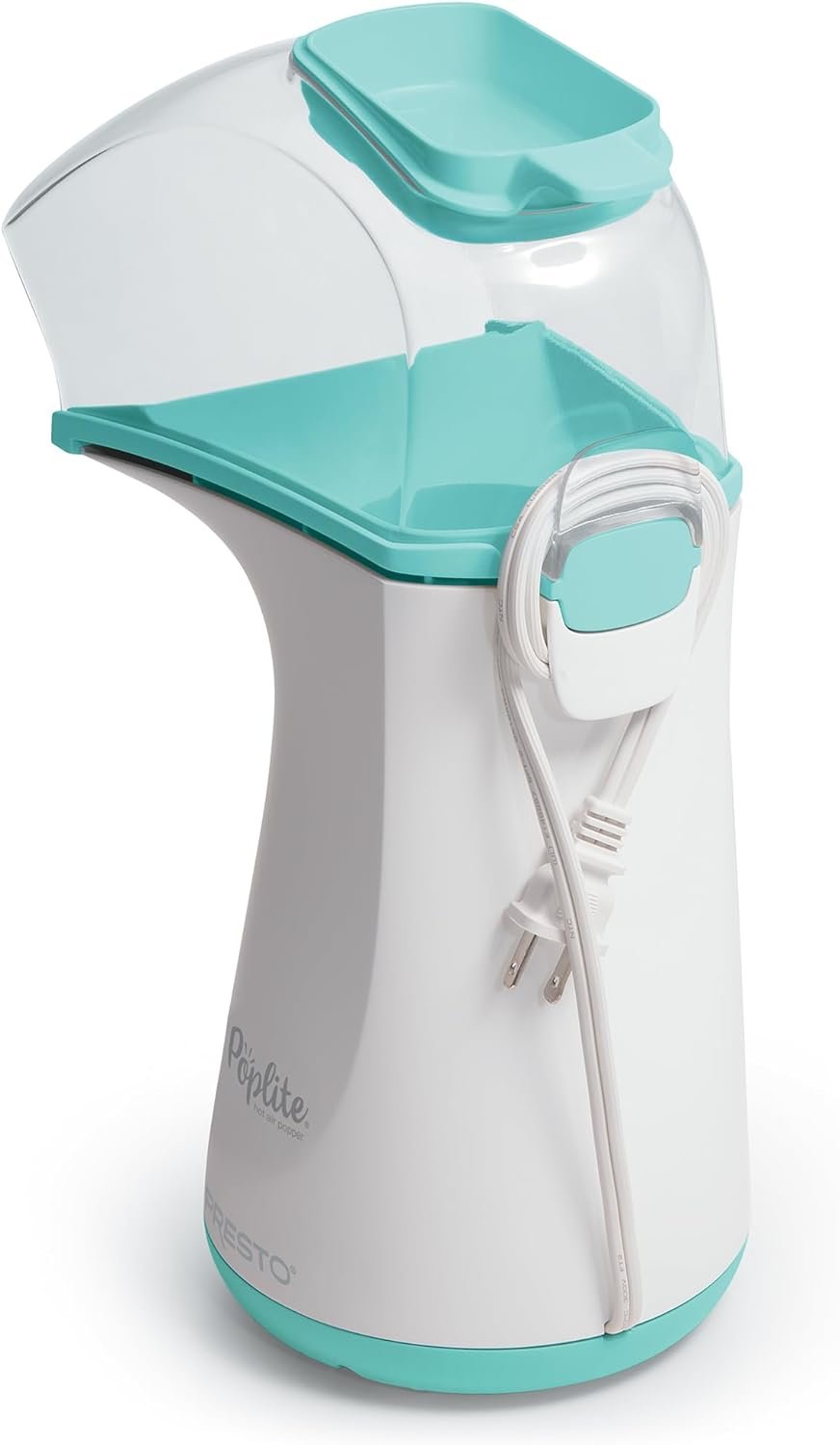 Pops with hot air, not oil, for a delicious low-fat treat! The PopLite® hot air popper pops up to 18 cups in less than 2 1/2 minutes and leaves virtually no unpopped kernels. It’s faster, healthier, and more economical than most microwave bag popcorn. Hot air popcorn is a heart-healthy, all-natural snack with no artificial flavors or added salt, and zero grams of saturated fat per serving. PopLite® uses regular or gourmet popcorn for about a third the cost of microwave bags. The measuring scoop makes measuring the right amount of popcorn every time easy and convenient, and also doubles as a handy butter melter when you want a special treat. The chute directs popped kernels right into your bowl. Cleanup is easy too! PopLite® pops without oil, so the base and cover simply wipe clean once you’re done. A built-in cord wrap provides convenient storage.