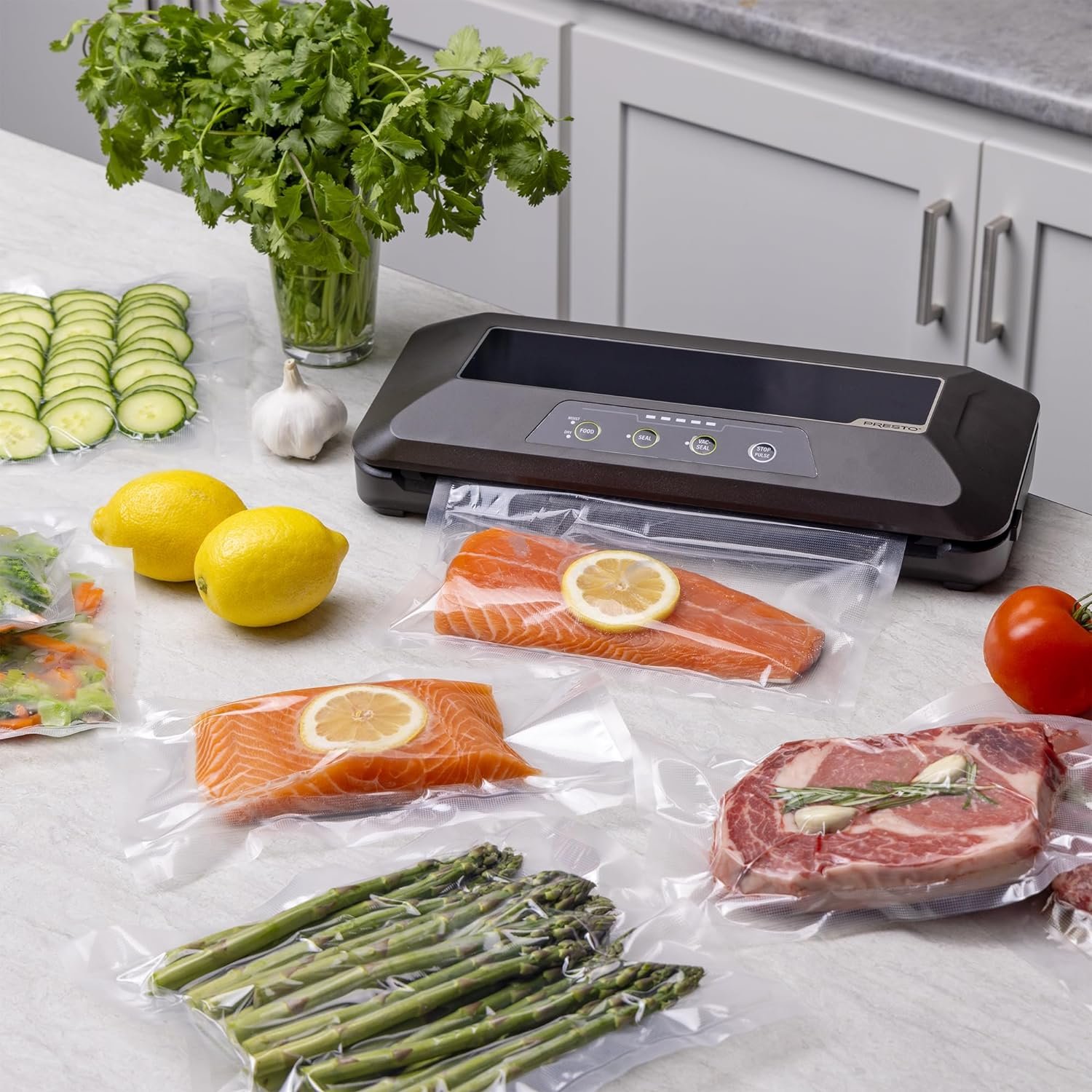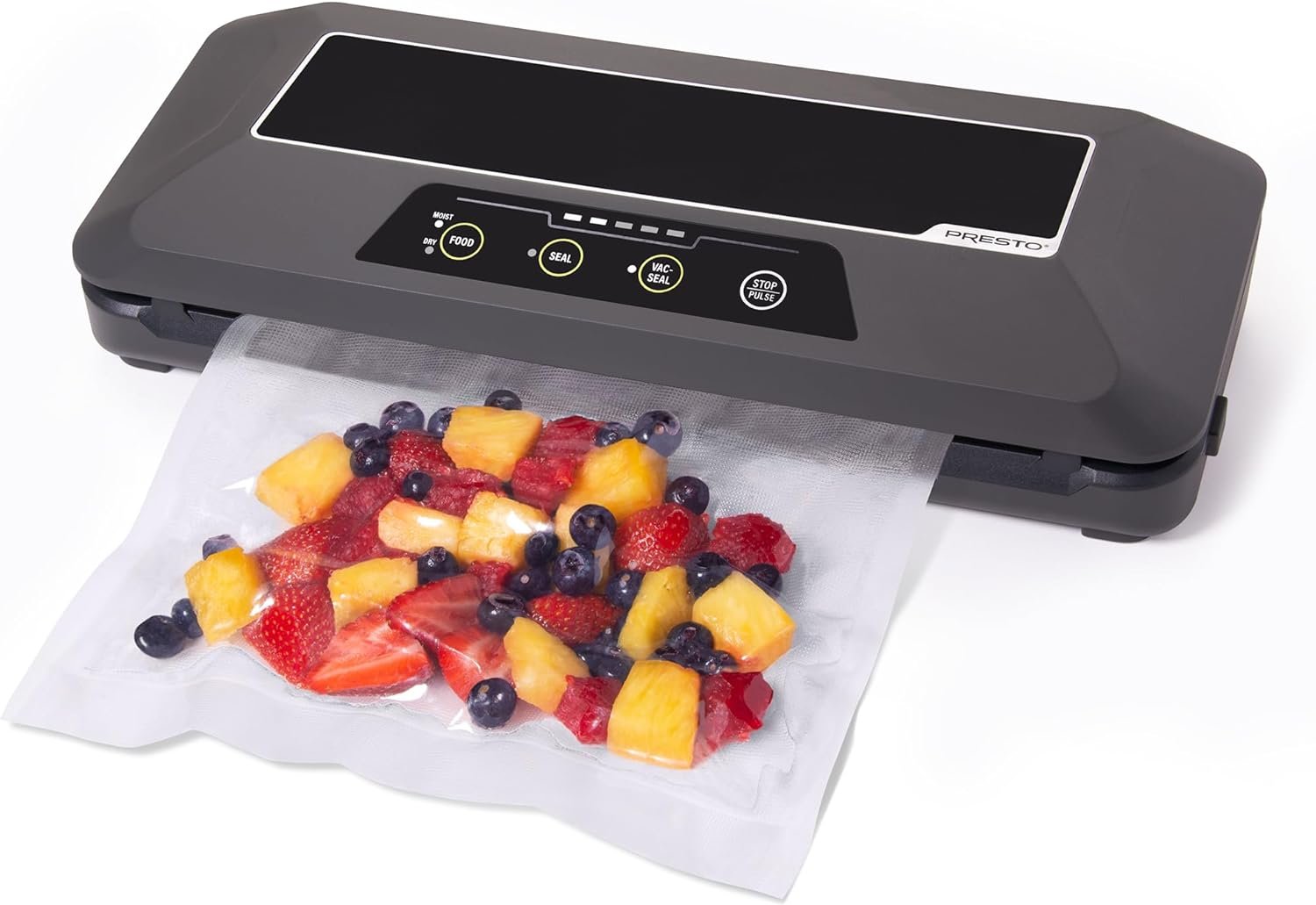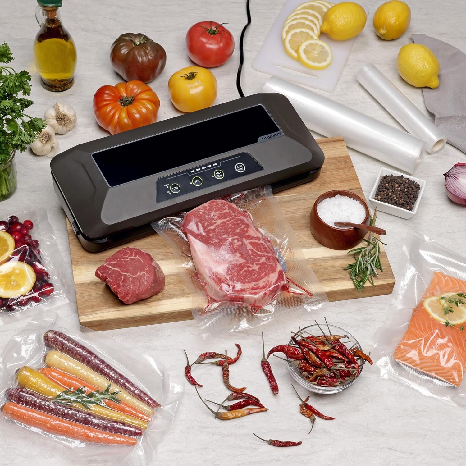 Buy in bulk and keep food fresh for up to 5x longer than ordinary methods with the Presto® FreshDaddy™ Automatic Electric Vacuum Sealer. With a bag roll storage bay and built-in bag cutter, this vacuum sealer is the ideal choice for food storage in the freezer, refrigerator, and pantry. Select settings for moist or dry food, seal only, and vacuum seal. The stop/pulse function offers manual control for soft, delicate foods. The starter bag set includes one 11” x 20’ roll for making bags and one gallon-size reusable zipper bag with port, as well as a vacuum tube accessory for use with zipper bags with ports. Cut custom-length bags in seconds, then vacuum seal portioned packs of vegetables, fish, and meat to streamline your meal planning. Preserve in-season fruit to enjoy healthy smoothies all year. An airtight vacuum seal prevents freezer burn and reduces waste. This Presto® vacuum sealer is a great companion when preparing food for sous vide. Food sealed in vacuum bags assures perfect sous vide meals every time. Also safeguards non-food items from moisture or corrosion. Works with FreshDaddy™ and most other brands of rolls and bags.