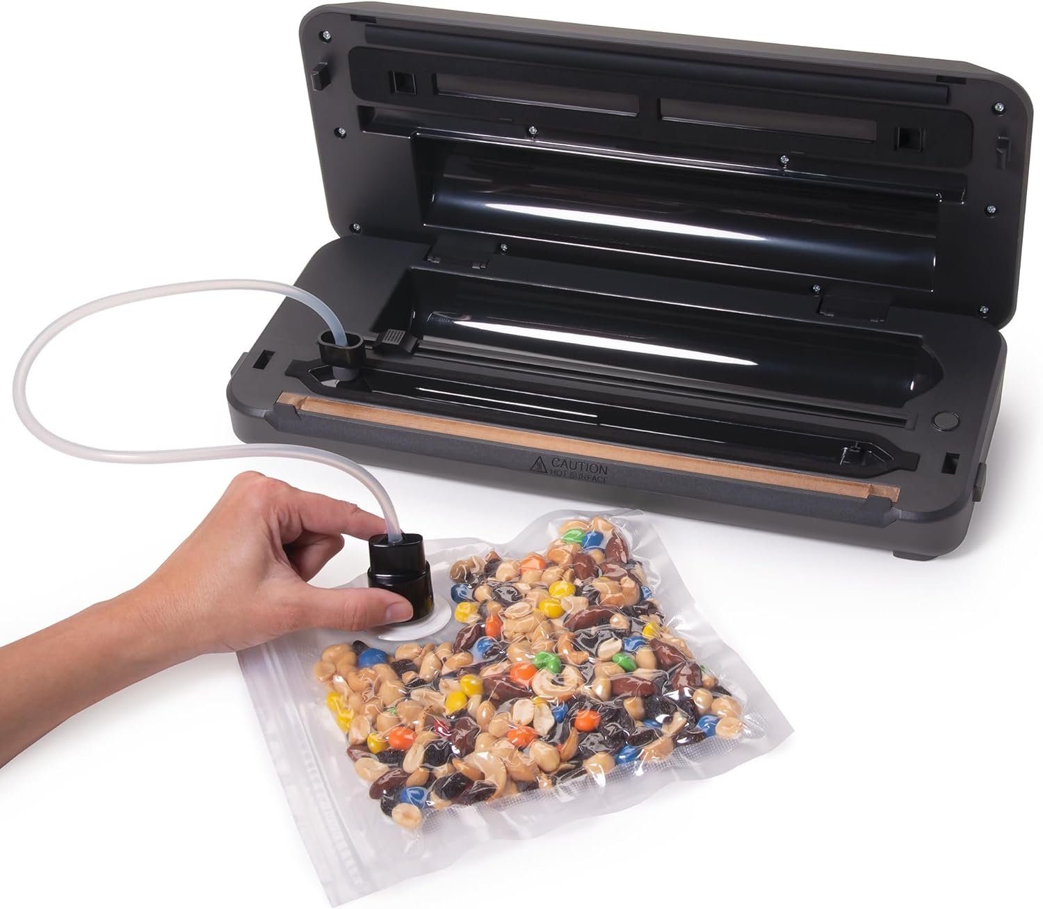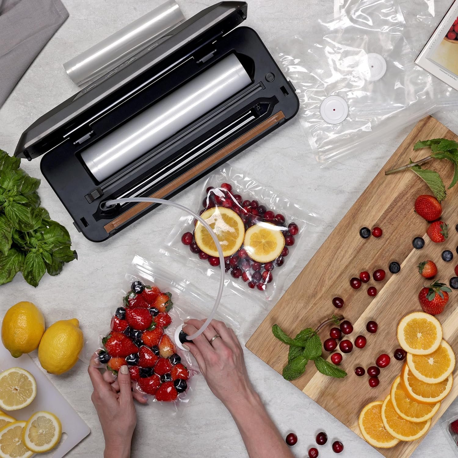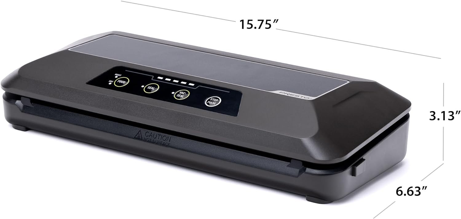 Buy in bulk and keep food fresh for up to 5x longer than ordinary methods with the Presto® FreshDaddy™ Automatic Electric Vacuum Sealer. With a bag roll storage bay and built-in bag cutter, this vacuum sealer is the ideal choice for food storage in the freezer, refrigerator, and pantry. Select settings for moist or dry food, seal only, and vacuum seal. The stop/pulse function offers manual control for soft, delicate foods. The starter bag set includes one 11” x 20’ roll for making bags and one gallon-size reusable zipper bag with port, as well as a vacuum tube accessory for use with zipper bags with ports. Cut custom-length bags in seconds, then vacuum seal portioned packs of vegetables, fish, and meat to streamline your meal planning. Preserve in-season fruit to enjoy healthy smoothies all year. An airtight vacuum seal prevents freezer burn and reduces waste. This Presto® vacuum sealer is a great companion when preparing food for sous vide. Food sealed in vacuum bags assures perfect sous vide meals every time. Also safeguards non-food items from moisture or corrosion. Works with FreshDaddy™ and most other brands of rolls and bags.