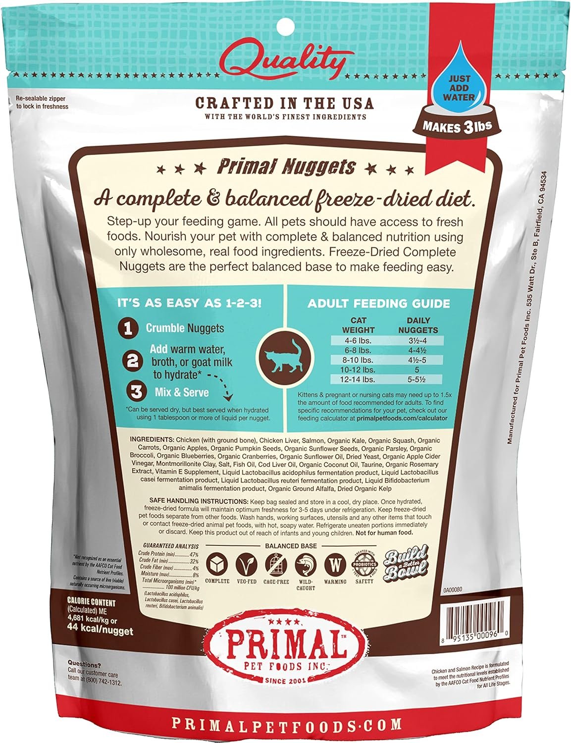 Premium freeze-dried raw cat food made with made with cage-free chicken raised without antibiotics, steroids or added hormones, wild-caught salmon and USDA certified organic fruits and vegetables. Grain free