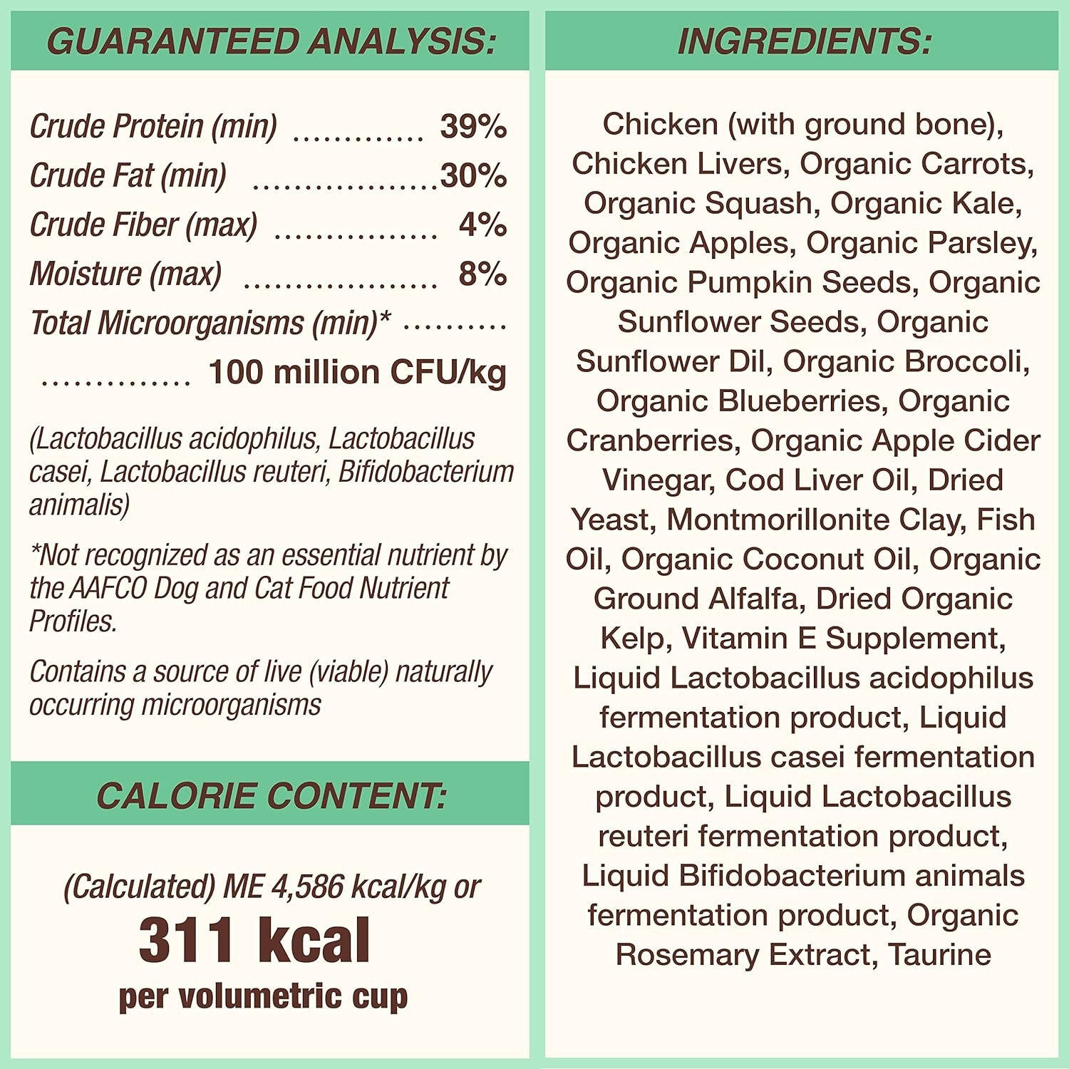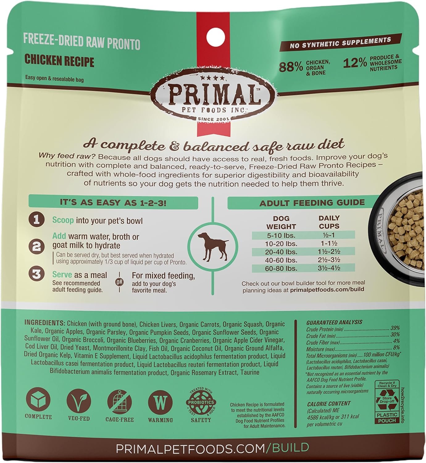 Premium freeze dried raw dog food made with cage-free chicken, raised without antibiotics, steroids or added hormones and with USDA certified organic fruits and vegetables. Grain free