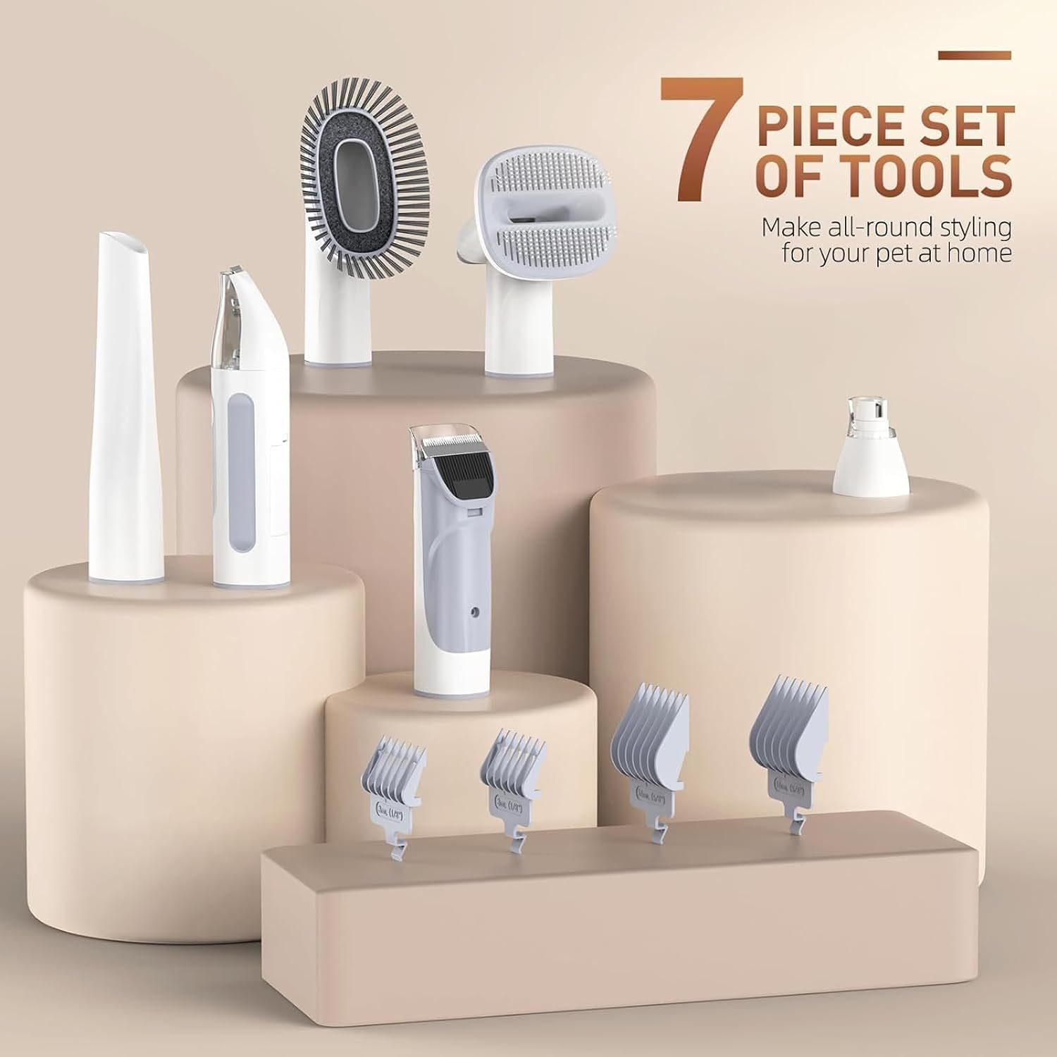 【7 in 1 Professional Grooming Set 】 This pet grooming clipper comes with 8 proven grooming tools; Nozzle heads and cleaning brushes can be used to collect pet hair that has fallen on carpets, sofas and floors: grooming brushes and hair removal brushes that help prevent damage to hair surfaces while promoting soft, smooth, healthy pet skin; Electric scissors provide superior cutting performance.
