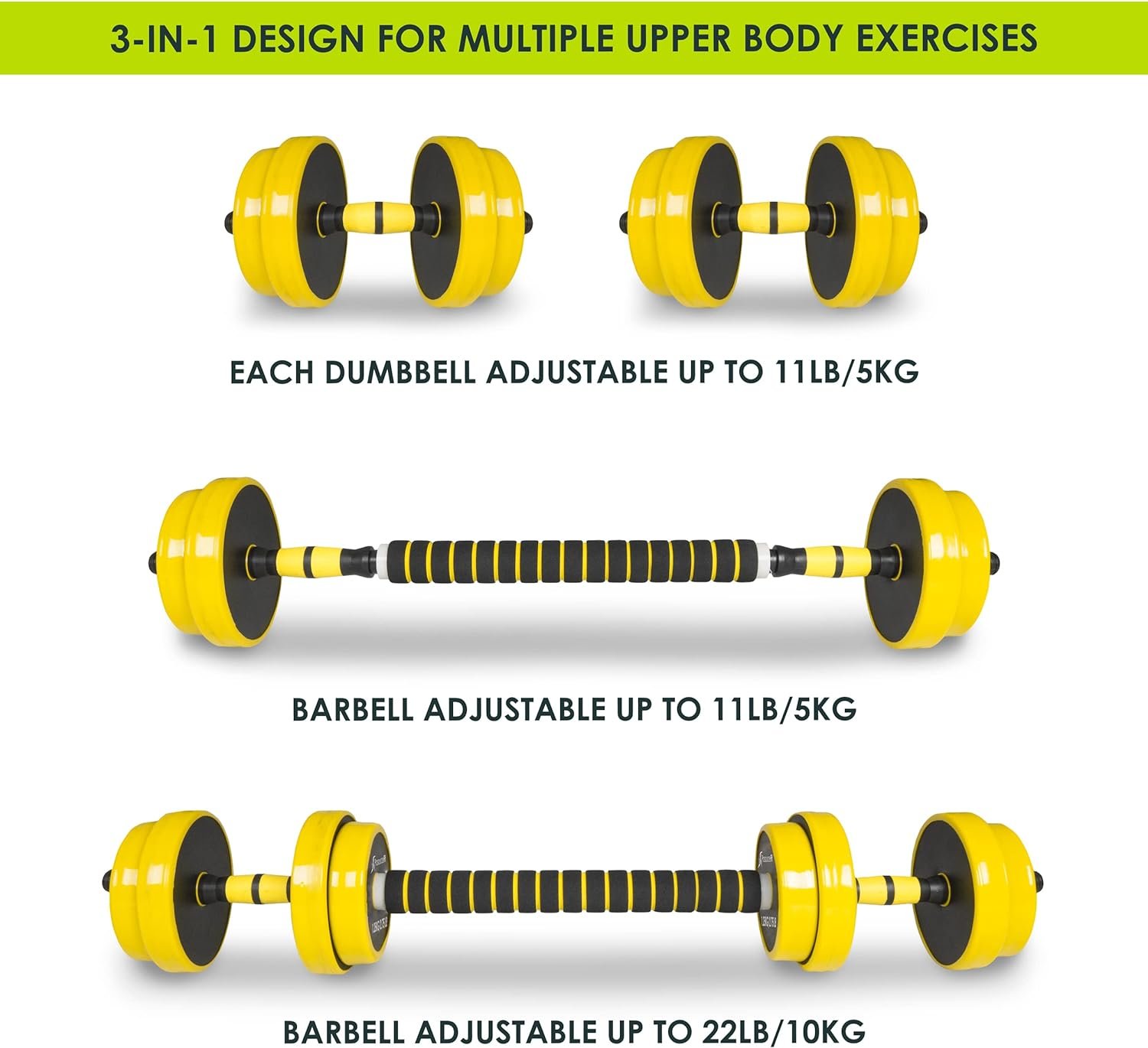 8 ADJUSTABLE WEIGHTS – 8 weight plates are included: 2.2lb x 4, 2.75lb x 4. Mix and match weight plates to create the ideal weight for your workout. Easily slide plates on dumbbells and barbell and secure in place with the durable 4 spinlock collars.